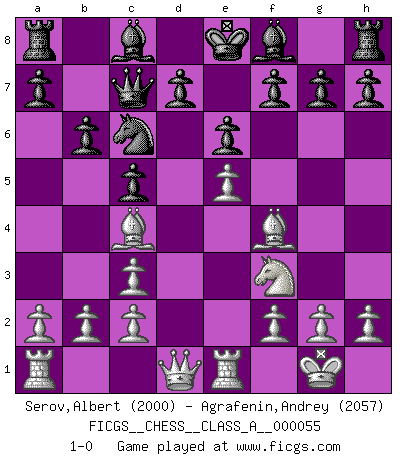 Last move : 1-0 2009 October 9 8:42:14 [Event "FICGS__CHESS__CLASS_A__000055"] [Site "FICGS"] [Date "2009.08.12"] [Round "1"] [White "Serov,Albert"] [Black "Agrafenin,Andrey"] [Result "1-0"] [WhiteElo "2000"] [BlackElo "2057"] 1.e4 c5 2.Nf3 Nf6 3.e5 Nd5 4.Nc3 Nxc3 5.dxc3 Nc6 6.Bf4 e6 7.Bc4 Qc7 8.O-O b6 9.Re1 1-0 This chess game has been lost on time (started : 2009.08.12 14:43:46) Sicilian : Nimzovich-Rubinstein variation Kingside Castling by player White (move 8) Player White won this chess game. Follow this game move after move (download)The combination player thinks forward; he starts from the given position, and tries the forceful moves in his mind. (Emanuel Lasker) Offener Brief an US-Präsident Bush anlässlich der Verhaftung Bobby Fishers: Verhaften Sie mich. Stecken Sie mich in dieselbe Zelle wie Bobby Fisher und geben Sie uns ein Schachspiel mit. (Boris Vassilievich Spassky) Aún deseo matar a Fischer. (Boris Spassky) Pour se monter efficace, un Cavalier a besoin d'avant-postes ! Les Cavaliers font les meilleurs bloqueurs de pions passés. When the going gets tactical, the computers get going. (Hyatt)