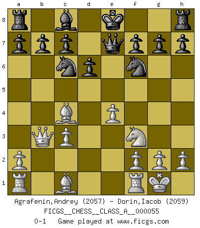 Last move : 0-1 2009 September 29 22:11:9 [Event "FICGS__CHESS__CLASS_A__000055"] [Site "FICGS"] [Date "2009.08.12"] [Round "1"] [White "Agrafenin,Andrey"] [Black "Dorin,Iacob"] [Result "0-1"] [WhiteElo "2057"] [BlackElo "2059"] 1.e4 e5 2.Nf3 Nc6 3.d4 exd4 4.c3 dxc3 5.Nxc3 Bb4 6.Bc4 d6 7.Qb3 Bxc3+ 8.bxc3 Qe7 9.O-O Nf6 0-1 This chess game has been lost on time (started : 2009.08.12 14:43:46) Scotch : Goering gambit Kingside Castling by player White (move 9) Player Black won this chess game. Follow this game move after move (download)Chess is a forcing house where the fruits of character can ripen more fully than in life. (Edward Morgan Foster) Du weisst es gibt ein Problem mit Computern und Fernschach, wenn jeder eine Rating von 2450 hat. (John Christen Knudsen) La pasion por jugar al Ajedrez es una de las mas inexplicables en el mundo. (H.G. Wells) La vie et les Echecs sont tous les deux une lutte constante. (Lasker) Perseverance does not equal worthiness. Next time you want to get my attention, wear something fun. Low-riding jeans are hot. (Gregory House, House M.D.)