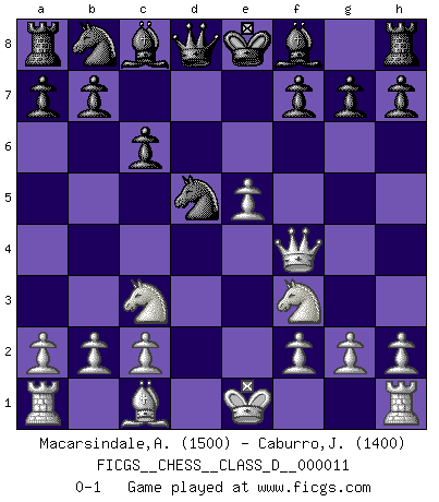 Last move : 0-1 2007 January 18 0:34:29 [Event "FICGS__CHESS__CLASS_D__000011"] [Site "FICGS"] [Date "2006.09.21"] [Round "1"] [White "Macarsindale,Arthur Alfred"] [Black "Caburro,John"] [Result "0-1"] [WhiteElo "1500"] [BlackElo "1400"] 1.e4 e5 2.Bc4 Nf6 3.Nc3 c6 4.d4 exd4 5.Qxd4 d5 6.e5 Nfd7 7.Nf3 dxc4 8.Qxc4 Nb6 9.Qf4 Nd5 0-1 Bishop's Opening : Berlin defense Player Black won this chess game. Follow this game move after move (download)I love all positions. Give me a difficult positional game, I will play it. But totally won positions, I cannot stand them. (Hein Donner) Es ist wirklich schade, dass so viele Schachspieler nicht auf ihr Äußeres achten! (Alexandra Kosteniuk) ¿Quién es tu oponente esta tarde? Esta tarde mi oponente son las piezas negras. (Akiba Rubinstein) Aux échecs, les retours au sommet sont rares : les dommages psychologiques consécutifs à une défaite sont trop sévères. (Daily Telegraph) See no evil, hear no evil, speak no evil. (The 3 monkeys)