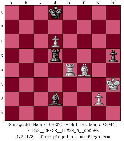 Last move : 1/2-1/2 2010 February 14 8:28:35 [Event "FICGS__CHESS__CLASS_A__000055"] [Site "FICGS"] [Date "2009.08.12"] [Round "1"] [White "Soszynski,Marek"] [Black "Helmer,Janos"] [Result "1/2-1/2"] [WhiteElo "2009"] [BlackElo "2044"] 1.e4 c5 2.Nf3 Nc6 3.Bb5 g6 4.O-O Bg7 5.c3 Nf6 6.Re1 O-O 7.e5 Nd5 8.d4 cxd4 9.cxd4 d6 10.Nc3 Nxc3 11.bxc3 Qa5 12.Qa4 Qxa4 13.Bxa4 Bg4 14.Rb1 Na5 15.Bg5 f6 16.exd6 exd6 17.Bf4 Rfd8 18.Nd2 b6 19.Nb3 Nc4 20.Bc6 Rac8 21.Bd5+ Kf8 22.Nd2 Nxd2 23.Bxd2 Bd7 24.Bf4 Bc6 25.Be6 Rc7 26.h4 Be8 27.c4 Re7 28.d5 Bf7 29.a4 h6 30.a5 g5 31.Bh2 f5 32.axb6 axb6 33.Bxf5 Bd4 34.Rxe7 Kxe7 35.Bg3 Kf6 36.Bd3 Bc5 37.Ra1 Bg6 38.Bxg6 Kxg6 39.Kh2 gxh4 40.Bxh4 Rf8 41.Bg3 Bxf2 42.Bxd6 Rc8 43.Ra2 Bd4 44.Ra4 Kf5 45.Bg3 h5 46.Kh3 Rc5 47.Rb4 Rc8 48.d6 Ke6 49.Rb1 Bc3 50.Rd1 Kd7 51.Rf1 Ke8 52.Rf4 Rc5 53.Re4+ Kd8 54.Bh2 b5 55.cxb5 Rxb5 56.Bg3 Rd5 57.Bf4 Bd2 1/2-1/2 Sicilian : Nimzovich-Rossolimo attack (with ...g6, without ...d6) Kingside Castling by player White (move 4) Kingside Castling by player Black (move 6) 10 pieces endgame at move 55 : White KRBPPP , Black KRBP WHITE : King + 1 Rook 1 Bishop 3 Pawns BLACK : King + 1 Rook 1 Bishop 1 Pawn 9 pieces endgame at move 55 : White KRBPP , Black KRBP WHITE : King + 1 Rook 1 Bishop 2 Pawns BLACK : King + 1 Rook 1 Bishop 1 Pawn This chess game ended in a draw. Follow this game move after move (download)Spassky will not be psyched out by Fischer. (Mike Goodall) Die Leute spielen gegen mich seit 15 Jahren unter Ihren Möglichkeiten. (Robert James Fischer) En el tablero, la mentira e hipocresía no sobreviven mucho. (Emanuel Lasker) On entre au jeu d'Echecs comme on entre en Religion. Pour le joueur d'Echecs, la partie d'Echecs c'est l'office, la messe, le défilé du 1er Mai, le dépôt de gerbe au Monument aux Morts. C'est un drame sacré. (Michel Roos) When you don't know what to do, walk fast and look worried. (Anonymous)