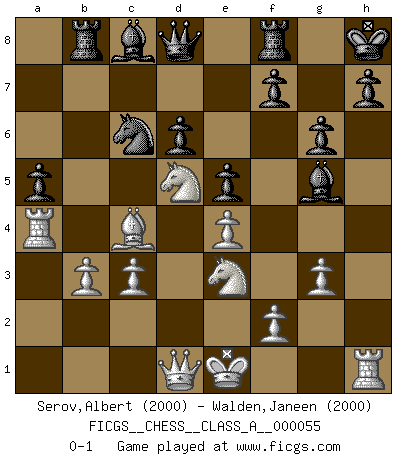 Last move : 0-1 2009 December 5 8:58:36 [Event "FICGS__CHESS__CLASS_A__000055"] [Site "FICGS"] [Date "2009.08.12"] [Round "1"] [White "Serov,Albert"] [Black "Walden,Janeen"] [Result "0-1"] [WhiteElo "2000"] [BlackElo "2000"] 1.e4 c5 2.Nf3 Nc6 3.d4 cxd4 4.Nxd4 Nf6 5.Nc3 e5 6.Ndb5 d6 7.Bg5 a6 8.Na3 b5 9.Nd5 Be7 10.Bxf6 Bxf6 11.c3 O-O 12.Nc2 Bg5 13.a4 bxa4 14.Rxa4 a5 15.Bc4 Rb8 16.b3 Kh8 17.Nce3 g6 18.h4 Bxh4 19.g3 Bg5 0-1 Sicilian : Pelikan (Lasker/Sveshnikov) variation Kingside Castling by player Black (move 11) Player Black won this chess game. Follow this game move after move (download)There are two classes of men; those who are content to yield to circumstances and who play whist; those who aim to control circumstances, and who play Chess. (Mortimer Collins) Strategie ist, wie man ein Mädchen auf den Rücksitz bekommt. Taktik ist, was man tut, wenn man dann dort ist. (Anonymous) Entre mas años cumplo, mas valoro los Peones. (Keres) Les Echecs ne sont pas pour les âmes timides. Ils requièrent un homme entier, qui ne s'arrête pas aveuglément à ce qui a été déjà établi, mais qui tente individuellement de sonder les profondeurs du jeu. (W. Steinitz) Horse racing is animated roulette. (Roger Kahn)