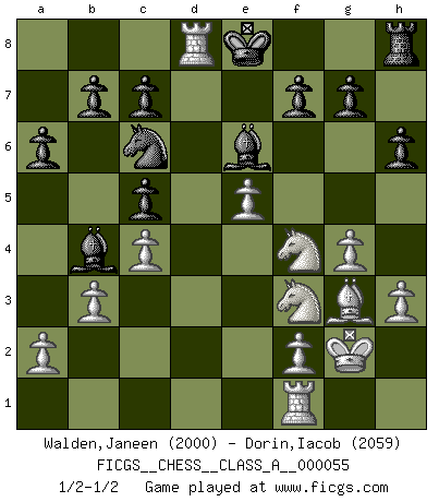 Last move : 1/2-1/2 2009 November 5 16:41:35 [Event "FICGS__CHESS__CLASS_A__000055"] [Site "FICGS"] [Date "2009.08.12"] [Round "1"] [White "Walden,Janeen"] [Black "Dorin,Iacob"] [Result "1/2-1/2"] [WhiteElo "2000"] [BlackElo "2059"] 1.e4 e5 2.Nf3 Nc6 3.Bb5 Nf6 4.O-O Nxe4 5.d4 Nd6 6.Bxc6 dxc6 7.dxe5 Nf5 8.Qxd8+ Kxd8 9.Nc3 Ke8 10.h3 Be7 11.Bf4 Be6 12.b3 Rd8 13.Rad1 h6 14.Ne2 Ba3 15.c4 c5 16.g4 Ne7 17.Bg3 Nc6 18.Nf4 a6 19.Kg2 Bb4 20.Rxd8+ 1/2-1/2 Ruy Lopez : Berlin defense, Open variation Kingside Castling by player White (move 4) This chess game ended in a draw. Follow this game move after move (download)Though most people love to look at the games of the great attacking masters, some of the most successful players in history have been the quiet positional players. They slowly grind you down by taking away your space, tying up your pieces, and leaving you with virtually nothing to do ! (Yasser Seirawan) Wir irren allesamt, nur jeder irrt anders. (Georg Christoph Lichtenberg) Un jugador que es sorprendido, esta derrotado a medias. (Proverbio) Le succès, c'est être capable d'aller d'échec en échec sans perdre son enthousiasme. (Winston Churchill) Don't be discouraged. It's often the last key in the bunch that opens the lock. (Author unknown)