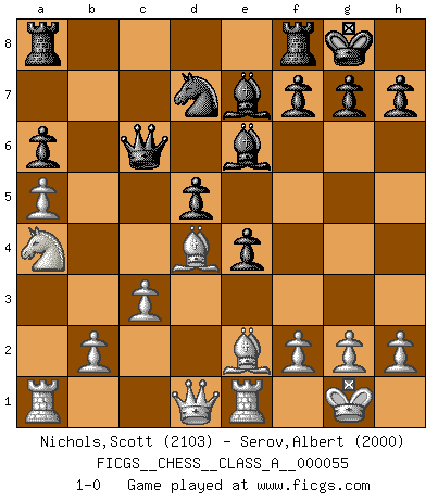 Last move : 1-0 2009 December 2 20:51:35 [Event "FICGS__CHESS__CLASS_A__000055"] [Site "FICGS"] [Date "2009.08.12"] [Round "1"] [White "Nichols,Scott"] [Black "Serov,Albert"] [Result "1-0"] [WhiteElo "2103"] [BlackElo "2000"] 1.e4 c5 2.Nf3 d6 3.d4 cxd4 4.Nxd4 Nf6 5.Nc3 a6 6.Bc4 e6 7.a4 Be7 8.O-O Nc6 9.Nxc6 bxc6 10.a5 d5 11.exd5 cxd5 12.Bd3 O-O 13.Be3 e5 14.Bb6 Qd7 15.Na4 Qc6 16.Re1 e4 17.Be2 Be6 18.c3 Nd7 19.Bd4 1-0 Sicilian : Najdorf, Lipnitzky attack Kingside Castling by player White (move 8) Kingside Castling by player Black (move 12) Player White won this chess game. Follow this game move after move (download)By playing at Chess then, we may learn: First: Foresight... Second: Circumspection... Third: Caution... And lastly, we learn by Chess the habit of not being discouraged by present bad appearances in the state of our affairs, the habit of hoping for a favorable chance, and that of persevering in the secrets of resources. (Benjamin Franklin) Charakterschwächen offenbaren sich normalerweise während einer Schachpartie. (Garry Kasparov) Debes de llevar a tu oponente hacia un profundo y obscuro bosque donde 2+2=5, y el camino que conduce a la salida es suficientemente ancho para solamente uno. (Mikhail Tal) Fischer est le meilleur joueur du monde et Karpov n'est qu'un joueur de bistrot. (Garry Kasparov, agé de 16 ans) Beep ! (R2D2 in Star Wars ep.3)