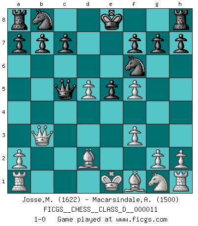 Last move : 1-0 2007 January 18 6:35:21 [Event "FICGS__CHESS__CLASS_D__000011"] [Site "FICGS"] [Date "2006.09.21"] [Round "1"] [White "Josse,Mark"] [Black "Macarsindale,Arthur Alfred"] [Result "1-0"] [WhiteElo "1622"] [BlackElo "1500"] 1.d4 d5 2.c4 Bf5 3.cxd5 Qxd5 4.Nc3 Qa5 5.f3 e5 6.d5 Nf6 7.e4 Bb4 8.exf5 Bxc3+ 9.bxc3 Qxc3+ 10.Bd2 Qc5 11.Qb3 1-0 QGD : Grau (Sahovic) defense Player White won this chess game. Follow this game move after move (download)That's what Chess is all about. One day you give your opponent a lesson, the next day he gives you one. (Bobby Fischer) Schach ist ein schwarz-weisser Dschungel. (Garry Kasparov) En el Ajedrez, cuando menos, el valiente hereda la tierra. (Edmar Mednis) RxDa4 pat (...) Yoga is 99% practice and 1% knowledge. (Sri Krishna Pattabhi Jois)