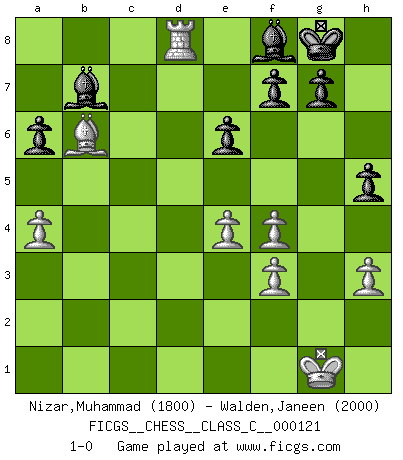 Last move : 1-0 2010 February 21 8:12:58 [Event "FICGS__CHESS__CLASS_C__000121"] [Site "FICGS"] [Date "2009.08.12"] [Round "1"] [White "Nizar,Muhammad"] [Black "Walden,Janeen"] [Result "1-0"] [WhiteElo "1800"] [BlackElo "2000"] 1.d4 d5 2.c4 c6 3.Nc3 Nf6 4.Nf3 e6 5.e3 Bd6 6.Bd3 O-O 7.Qc2 Nbd7 8.O-O dxc4 9.Bxc4 a6 10.Bd2 c5 11.a4 Qc7 12.dxc5 Nxc5 13.Rfc1 b6 14.b4 Ncd7 15.Qb3 Ne5 16.Nxe5 Bxe5 17.h3 Bb7 18.Ra2 Rad8 19.Be2 Qb8 20.Rac2 Rd7 21.Be1 Rfd8 22.f4 Bd6 23.Bc4 Bf8 24.Bh4 Rd2 25.Rxd2 Rxd2 26.Bf1 Qd6 27.Be1 Rd3 28.Bxd3 Qxd3 29.Bf2 Ne4 30.Qd1 Qc4 31.Nxe4 Qxe4 32.Qf3 Qxf3 33.gxf3 Bxb4 34.e4 Bd6 35.Rd1 Bf8 36.Bxb6 h5 37.Rd8 1-0 QGD Slav defense Kingside Castling by player Black (move 6) Kingside Castling by player White (move 8) Player White won this chess game. Follow this game move after move (download)Capture of the adverse King is the ultimate but not the first object of the game. (William Steinitz) Taktik ist was man tun muß, wenn etwas zu tun ist. Strategie ist was man tun muß, wenn nichts zu tun ist. (Savielly Grigorievitsch Tartakower) La vida es como un juego de Ajedrez, cambiando con cada movimiento. (Proverbio Chino) Les Echecs sont affaire de jugement sensible. Savoir quand frapper et quand esquiver. (Fischer) Drag your thoughts away from your troubles... by the ears, by the heels, or any other way you can manage it. (Mark Twain)
