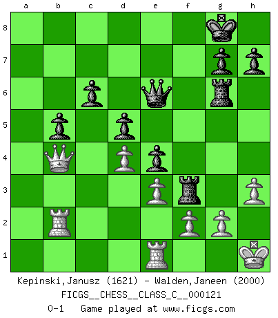 Last move : 0-1 2009 December 1 18:27:13 [Event "FICGS__CHESS__CLASS_C__000121"] [Site "FICGS"] [Date "2009.08.12"] [Round "1"] [White "Kepinski,Janusz"] [Black "Walden,Janeen"] [Result "0-1"] [WhiteElo "1621"] [BlackElo "2000"] 1.d4 d5 2.c4 c6 3.e3 Nf6 4.Nf3 Bf5 5.Nc3 e6 6.cxd5 exd5 7.Bd3 Bxd3 8.Qxd3 Bd6 9.O-O O-O 10.h3 Re8 11.Bd2 Nbd7 12.Rfe1 Ne4 13.Qc2 Ndf6 14.Nxe4 Nxe4 15.Bc3 f5 16.Qb3 Qb6 17.Qc2 Re6 18.a3 Rae8 19.Nd2 Rg6 20.Nxe4 fxe4 21.b4 R8e6 22.Rab1 a6 23.b5 axb5 24.Bb4 Qc7 25.Bxd6 Qxd6 26.Qb3 Re7 27.a4 bxa4 28.Qxa4 b5 29.Qb4 Qe6 30.Kh1 Rf7 31.Rb2 Rf3 0-1 QGD Slav defense Kingside Castling by player White (move 9) Kingside Castling by player Black (move 9) Player Black won this chess game. Follow this game move after move (download)When you don't know what to play, wait for an idea to come into your opponent's mind. You may be sure that idea will be wrong. (Siegbert Tarrasch) Zeige mir drei Eröffnungsvarianten und ich beweise dir, dass zwei davon inkorrekt sind. (Emanuel Lasker) El Ajedrez es el gimnasio de la mente. (Blaise Pascal) Il n'y a pas de prix trop élevé au scalp de l'ennemi. (Koblentz) The message for business people contemplating their place in the cyberspace is simple and direct: get linked or get lost. (Vic Sussman and Kenan Pollack)