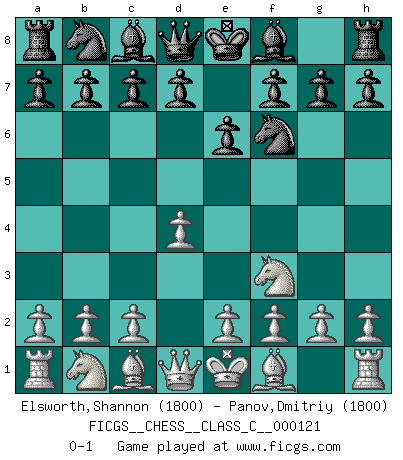 Last move : 0-1 2009 October 1 20:41:44 [Event "FICGS__CHESS__CLASS_C__000121"] [Site "FICGS"] [Date "2009.08.12"] [Round "1"] [White "Elsworth,Shannon"] [Black "Panov,Dmitriy"] [Result "0-1"] [WhiteElo "1800"] [BlackElo "1800"] 1.Nf3 Nf6 2.d4 e6 0-1 This chess game has been lost on time (started : 2009.08.12 16:49:38) Reti Opening Player Black won this chess game. Follow this game move after move (download)The passed Pawn is a criminal, who should be kept under lock and key. Mild measures, such as police surveillance, are not sufficient. (Aaron Nimzovich) Wer mein Gambit spielt, muß bereit sein, alle Brücken hinter sich abzubrechen. Es verändert den ganzen Menschen. Es wirkt wie ein Zauberstab und fördert verkümmerte, gute Charakter- eigenschaften wieder zu Tage. (Emil Joseph Diemer) El Ajedrez hace al hombre ser mas sabio y ver mas claro. (Vladimir Putin) On a dit que l'homme se distingue de l'animal par le fait qu'il achète plus de livres qu'il ne peut en lire. Je voudrais suggérer qu'inclure à la liste des livres quelques livres d'échecs rendrait la distinction manifeste. (Edward Lasker) He who laughs last probably does not get the joke. (Unknown)