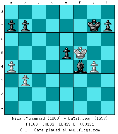 Last move : 0-1 2010 July 21 4:28:31 [Event "FICGS__CHESS__CLASS_C__000121"] [Site "FICGS"] [Date "2009.08.12"] [Round "1"] [White "Nizar,Muhammad"] [Black "Batal,Jean"] [Result "0-1"] [WhiteElo "1800"] [BlackElo "1697"] 1.d4 Nf6 2.c4 g6 3.Nc3 Bg7 4.e4 d6 5.Be2 O-O 6.Nf3 e5 7.O-O Nc6 8.d5 Ne7 9.Ne1 Nd7 10.Be3 f5 11.f3 f4 12.Bf2 g5 13.Nd3 Nf6 14.c5 Ng6 15.cxd6 cxd6 16.Qb3 Rf7 17.Rac1 g4 18.Nb5 g3 19.hxg3 fxg3 20.Bxg3 Nh5 21.Bh2 Bh6 22.Rc2 Be3+ 23.Nf2 Qg5 24.g4 Ngf4 25.Bd1 Bb6 26.Kh1 Rf6 27.Rg1 Ng7 28.Bxf4 Qxf4 29.Nh3 Rh6 30.Rh2 Qc1 31.Rf1 Rh4 32.Nxd6 Qh6 33.Nxc8 Rxh3 34.d6 Kh8 35.Qc2 Rxh2+ 36.Qxh2 Qxh2+ 37.Kxh2 Rxc8 38.Bb3 Rd8 39.Rd1 Ne8 40.d7 Nf6 41.Be6 Bd4 42.b3 Nxd7 43.Kg2 Nf8 44.Bc4 Ng6 45.a4 Nh4+ 46.Kf1 Nxf3 47.Ke2 Ng1+ 48.Kf1 Rf8+ 49.Kg2 Rf2+ 50.Kg3 Ne2+ 51.Kh4 Kg7 52.Bxe2 Rxe2 53.Rd3 Rxe4 54.Kg5 Re3 55.Rxe3 Bxe3+ 56.Kf5 Bf4 0-1 This chess game has been lost on time (started : 2009.08.12 16:49:38) King's Indian : 5.Be2 Kingside Castling by player Black (move 5) Kingside Castling by player White (move 7) 10 pieces endgame at move 55 : White KPPP , Black KBPPPP WHITE : King + 3 Pawns BLACK : King + 1 Bishop 4 Pawns Player Black won this chess game. Follow this game move after move (download)Only sissies Castle. (Rob Sillars) Über Kasparov: Es ist offensichtlich, daß er in einem totalitären Staat aufwuchs und deshalb zu diktatorischen Zügen neigt. (Viktor Kortschnoi) La enorme capacidad mental, en la que sin ella no puede un jugador de Ajedrez existir, es demasiado requerida por el Ajedrez al grado de que nunca podrá liberar su mente de este juego. (Albert Einstein) C'est une question de caractère, Beaucoup de gens perdent leur motivation très vite. D'autres, ils sont rares, peuvent la conserver très longtemps. J'aime les échecs, encore aujourd'hui je suis heureux d'analyser des parties. J'aime toujours gagner, je déteste encore perdre. Bien jouer est important pour mon intégrité intellectuelle et morale. Et puis les échecs vivent en ce moment une période historique grâce à Internet. Ils se développent dans les systèmes éducatifs à travers le monde. Ils sortent de leur ghetto, et c'est mon rôle de mener à bien cette révolution. (Gary Kasparov) The next best thing to gambling and winning is gambling and loosing. (Nick Dandalos)