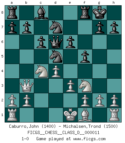 Last move : 1-0 2006 November 28 16:11:12 [Event "FICGS__CHESS__CLASS_D__000011"] [Site "FICGS"] [Date "2006.09.21"] [Round "1"] [White "Caburro,John"] [Black "Michalsen,Trond"] [Result "1-0"] [WhiteElo "1400"] [BlackElo "1500"] 1.d4 e6 2.Nf3 d5 3.Bf4 Bd6 4.Bxd6 Qxd6 5.c3 Nd7 6.Nbd2 f5 7.e3 Ngf6 8.Qb3 O-O 9.c4 c6 10.cxd5 Nxd5 11.Nc4 1-0 Queen's pawn Kingside Castling by player Black (move 8) Player White won this chess game. Follow this game move after move (download)If cunning alone were needed to excel, women would be the best Chess players. (Albin) Ich kämpfe solange mein Gegner einen Fehler machen kann. (Emanuel Lasker) El Ajedrez es realmente noventa y nueve por ciento calculación. (Soltis) Assurément je connaissais par expérience le mystérieux attrait de ce jeu royal, le seul entre tous les jeux inventés par les hommes qui échappe souverainement à la tyrannie du hasard, le seul où l'on ne doive sa victoire qu'à son intelligence ou plutôt à une certaine forme d'intelligence. Mais n'est-ce pas déjà le limiter injurieusement que d'appeler les échecs un jeu ? N'est-ce pas une science, un art ou quelque chose qui, comme le cercueil de Mahomet entre ciel et terre, est suspendu entre l'un et l'autre, et qui réunit un nombre incroyable de contraires ? [...] C'est une pensée qui ne mène à rien, une mathématique qui n'établit rien, un art qui ne laisse pas d'uvre, une architecture sans matière; et il l'a prouvé néanmoins qu'il était plus durable, à sa manière, que les livres ou que tout autre monument, ce jeu unique qui appartient à tous les peuples et à tous les temps, et dont personne ne sait quel dieu en fit don à la terre pour tuer l'ennui, pour aiguiser l'esprit et stimuler l'âme. Où commence-t-il, où finit-il ? (Stefan Zweig) When I took office, only high energy physicists had ever heard of what is called the World Wide Web... Now even my cat has its own page. (Bill Clinton, 1996)