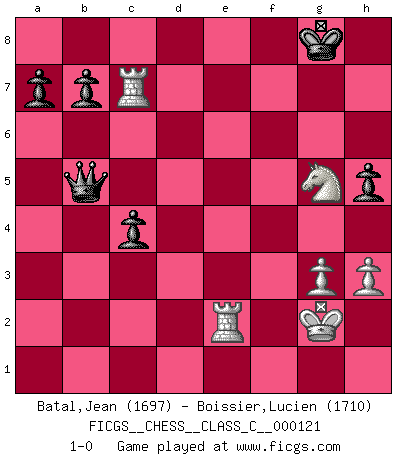 Last move : 1-0 2009 December 26 8:0:53 [Event "FICGS__CHESS__CLASS_C__000121"] [Site "FICGS"] [Date "2009.08.12"] [Round "1"] [White "Batal,Jean"] [Black "Boissier,Lucien"] [Result "1-0"] [WhiteElo "1697"] [BlackElo "1710"] 1.Nf3 d5 2.g3 Nf6 3.Bg2 c6 4.O-O Bg4 5.d3 Nbd7 6.Nbd2 e5 7.e4 Bc5 8.h3 Be6 9.exd5 Bxd5 10.d4 exd4 11.Re1+ Be7 12.Qe2 Nc5 13.Nxd4 Bxg2 14.Kxg2 O-O 15.Qxe7 Qxd4 16.Nf3 Qc4 17.b3 Qxc2 18.Re2 Qc3 19.Bb2 Qd3 20.Bxf6 gxf6 21.Rd2 Qc3 22.Re1 Rae8 23.Qxe8 Rxe8 24.Rxe8+ Kg7 25.b4 Ne6 26.Rd7 Qc4 27.R8e7 Ng5 28.Nd4 Kg6 29.f4 Qxa2+ 30.Re2 Qa4 31.Rd8 h5 32.fxg5 Qxb4 33.gxf6 c5 34.Nf3 Kxf6 35.Rd6+ Kg7 36.Ng5 c4 37.Rd7 Qb5 38.Rxf7+ Kg8 39.Rc7 1-0 Reti : King's Indian attack, Yugoslav variation Kingside Castling by player White (move 4) Kingside Castling by player Black (move 14) Player White won this chess game. Follow this game move after move (download)All I want to do, ever, is just play Chess. (Bobby Fischer) Mutter, ich bin eben Ex-Weltmeister geworden. --beim nach Hause Kommen nach dem Verlust des WM-Titels an Mihail Botvinnik -- (Mikhail Nekhemyevich Tal) Hay dos clases de hombres: aquellos que se conforman en dejarse llevar por las circunstancias y que juegan barajas y aquellos decididos a controlar las circunstancias y que juegan al Ajedrez. (Mortimer Collins) On est toujours la mazette de quelqu'un d'autre. (Anonyme) If you work for a living, why do you kill yourself working ? (Tuco to a chicken in The Good, The Bad and The Ugly)