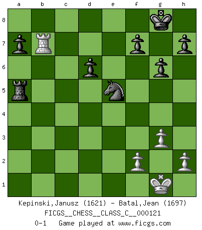 Last move : 0-1 2009 September 27 21:22:19 [Event "FICGS__CHESS__CLASS_C__000121"] [Site "FICGS"] [Date "2009.08.12"] [Round "1"] [White "Kepinski,Janusz"] [Black "Batal,Jean"] [Result "0-1"] [WhiteElo "1621"] [BlackElo "1697"] 1.d4 Nf6 2.c4 g6 3.Nf3 Bg7 4.e3 O-O 5.Bd3 d6 6.O-O Nbd7 7.a4 e5 8.Nc3 Re8 9.Re1 e4 10.Be2 exf3 11.Bxf3 c5 12.dxc5 Nxc5 13.e4 Qb6 14.Nd5 Nxd5 15.exd5 Rxe1+ 16.Qxe1 Bf5 17.a5 Qb3 18.Qe7 Bxb2 19.Bxb2 Qxb2 20.Re1 Nd3 21.Qe2 Qxe2 22.Rxe2 Ne5 23.Be4 Bxe4 24.Rxe4 Rc8 25.g3 Rxc4 26.Re3 Rc5 27.Rb3 Rxd5 28.Rxb7 Rxa5 0-1 King's Indian, 3.Nf3 Kingside Castling by player Black (move 4) Kingside Castling by player White (move 6) Player Black won this chess game. Follow this game move after move (download)Every Chess master was once a beginner. (Chernev) Den Ruhm habe ich schon, jetzt brauche ich noch das Geld. (Wilhelm Steinitz) El juego del Ajedrez no es solamente una diversión quieta; algunas cualidades muy valuables de la mente se pueden adquirir y cultivar con el, como convertirlos en habitos disponibles para toda ocasión; ya que la vida es algo así como el Ajedrez. (Benjamin Franklin) La conception d'un plan est le processus par lequel un joueur exploite les avantages de sa position tout en s'efforçant d'en réduire au minimum les inconvénients. Afin de garantir le succès, un plan doit toujours se fonder sur un diagnostic objectif des particularités d'une position. La conception d'un plan est d'autant plus difficile que la position est équilibrée, et grandement facilitée lorsqu'il n'existe qu'un seul plan susceptible de répondre aux exigences de la position. (Harry Golombek) Creativity is inventing, experimenting, growing, taking risks, breaking rules, making mistakes, and having fun. (Mary Lou Cook)