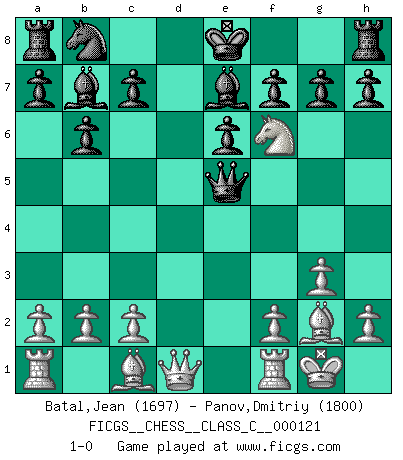 Last move : 1-0 2009 August 12 19:26:43 [Event "FICGS__CHESS__CLASS_C__000121"] [Site "FICGS"] [Date "2009.08.12"] [Round "1"] [White "Batal,Jean"] [Black "Panov,Dmitriy"] [Result "1-0"] [WhiteElo "1697"] [BlackElo "1800"] 1.Nf3 Nf6 2.g3 b6 3.Bg2 Bb7 4.O-O e6 5.d3 d5 6.Nbd2 Be7 7.e4 dxe4 8.dxe4 Nxe4 9.Ne5 Qd4 10.Nxe4 Qxe5 11.Nf6+ 1-0 Reti Opening Kingside Castling by player White (move 4) Player White won this chess game. Follow this game move after move (download)Avoid the crowd. Do your own thinking independently. Be the Chess player, not the Chess piece. (Ralph Charell) Wie ich sie so einen nach dem anderen nieder mähte wurde meine Überlegenheit offensichtlich. (José Raúl Capablanca) El Ajedrez es una hermosa aventura. (Bent Larsen) Aux échecs, les retours au sommet sont rares : les dommages psychologiques consécutifs à une défaite sont trop sévères. (Daily Telegraph) The existence of forgetting has never been proved: We only know that some things don't come to mind when we want them. (Friedrich Nietzsche)