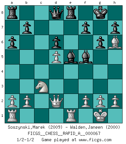 Last move : 1/2-1/2 2009 September 13 22:45:30 [Event "FICGS__CHESS__RAPID_A__000067"] [Site "FICGS"] [Date "2009.08.13"] [Round "1"] [White "Soszynski,Marek"] [Black "Walden,Janeen"] [Result "1/2-1/2"] [WhiteElo "2009"] [BlackElo "2000"] 1.e4 c5 2.Nf3 Nc6 3.Bb5 g6 4.O-O Bg7 5.c3 Nf6 6.Re1 O-O 7.e5 Nd5 8.d4 cxd4 9.cxd4 Nc7 10.Nc3 Nxb5 11.Nxb5 a6 12.Nc3 d6 13.exd6 exd6 14.d5 Ne5 15.Nxe5 Bxe5 16.Bh6 Re8 17.Qd2 Bf5 1/2-1/2 Sicilian : Nimzovich-Rossolimo attack (with ...g6, without ...d6) Kingside Castling by player White (move 4) Kingside Castling by player Black (move 6) This chess game ended in a draw. Follow this game move after move (download)Chess, like any creative activity, can exist only through the combined efforts of those who have creative talent, and those who have the ability to organize their creative work. (Mikhail Botvinnik) Ein Buch ist ein Spiegel; wenn ein Affe hineinsieht, so kann kein Apostel heraus gucken. (Georg Christoph Lichtenberg) Un Peón pasado aumenta su poder a medida de que el número de piezas en el tablero disminuye. (Capablanca) Toutes les manuvres exécutées sur une colonne ouverte ont pour but ultime l'intrusion définitive sur la septième ou la huitième rangée, en plein cur de la position ennemie. (Aaron Nimzovitch) Games, world of games... There's always an opponent, and there's always a victim. (Revolver, movie)