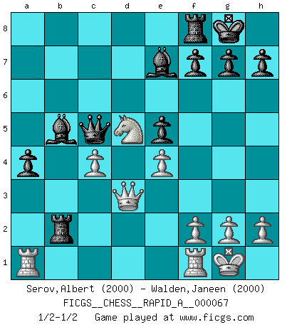 Last move : 1/2-1/2 2009 September 23 9:9:24 [Event "FICGS__CHESS__RAPID_A__000067"] [Site "FICGS"] [Date "2009.08.13"] [Round "1"] [White "Serov,Albert"] [Black "Walden,Janeen"] [Result "1/2-1/2"] [WhiteElo "2000"] [BlackElo "2000"] 1.e4 c5 2.Nf3 Nc6 3.d4 cxd4 4.Nxd4 Nf6 5.Nc3 e5 6.Ndb5 d6 7.Bg5 a6 8.Na3 b5 9.Nd5 Be7 10.Bxf6 Bxf6 11.c3 Bg5 12.Nc2 Rb8 13.a4 bxa4 14.Ncb4 Nxb4 15.Nxb4 Bd7 16.Bxa6 Qa5 17.Qxd6 Rb6 18.Qd3 Be7 19.Nd5 Rxb2 20.O-O Qc5 21.c4 O-O 22.Bb5 Bxb5 1/2-1/2 Sicilian : Pelikan (Lasker/Sveshnikov) variation Kingside Castling by player White (move 20) Kingside Castling by player Black (move 21) This chess game ended in a draw. Follow this game move after move (download)It is no time to be playing Chess when the house is on fire. (Italian Proverb) Ein Großmeister muß tausende Partien in seinem Kopf speichern, denn diese sind für Ihn, was die Worte der Muttersprache für gewöhnliche Leute sind, oder Noten für Musiker... (Garry Kasparov) Debes de llevar a tu oponente hacia un profundo y obscuro bosque donde 2+2=5, y el camino que conduce a la salida es suficientemente ancho para solamente uno. (Mikhail Tal) Le génie consiste à savoir transgresser les règles au moment opportun. (Teichmann) There is a very easy way to return from a casino with a small fortune : go there with a large one. (Jack Yelton)