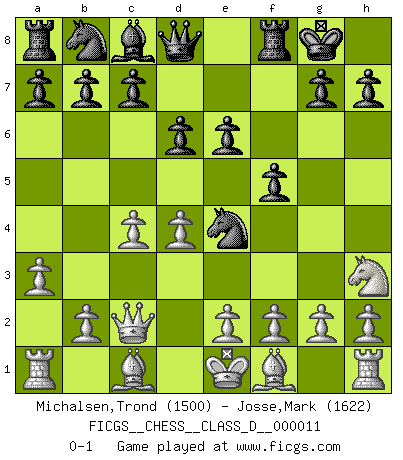 Last move : 0-1 2006 November 3 8:53:36 [Event "FICGS__CHESS__CLASS_D__000011"] [Site "FICGS"] [Date "2006.09.21"] [Round "1"] [White "Michalsen,Trond"] [Black "Josse,Mark"] [Result "0-1"] [WhiteElo "1500"] [BlackElo "1622"] 1.d4 Nf6 2.c4 e6 3.Nc3 Bb4 4.Qc2 O-O 5.a3 Bxc3+ 6.Qxc3 Ne4 7.Qc2 f5 8.Nh3 d6 0-1 This chess game has been lost on time (started : 2006.09.21 10:22:57) Nimzo-Indian : Classical variation Kingside Castling by player Black (move 4) Player Black won this chess game. Follow this game move after move (download)You need not play well - just help your opponent to play badly. (Genrikh Chepukaitis) Ich habe kein Problem mit Frauen, sondern nur mit dem Niveau ihres Schachspiels (Judith Polgar) El juego de Fischer siempre fue nítido, racional y brillante. Uno de los mejores por siempre. (Dave Regis) Les Echecs représentent une sphère d'idées créatrices basée sur la volonté des deux protagonistes. (Smyslov) Nobody is always a winner, and anybody who says he is, is either a liar or doesn't play poker. (Amarillo Slim)