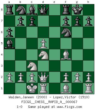 Last move : 1-0 2009 October 24 20:23:45 [Event "FICGS__CHESS__RAPID_A__000067"] [Site "FICGS"] [Date "2009.08.13"] [Round "1"] [White "Walden,Janeen"] [Black "Lopez,Victor"] [Result "1-0"] [WhiteElo "2000"] [BlackElo "1910"] 1.e4 e5 2.Nf3 d6 3.d4 exd4 4.Nxd4 Nf6 5.Nc3 Be7 6.Bf4 O-O 7.Qd2 d5 8.Ndb5 Bb4 9.O-O-O Ba5 10.exd5 a6 11.Nd4 1-0 This chess game has been lost on time (started : 2009.08.13 0:15:47) Philidor : Exchange variation Kingside Castling by player Black (move 6) Queenside Castling by player White (move 9) Player White won this chess game. Follow this game move after move (download)I know people who have all the will in the world, but still can't play good Chess. (Bobby Fischer) Ich erzeugte keinen Neid, da mich die Schachspieler als Musiker und die Musiker als Schachspieler betrachteten. (Mark Taimanov) Todavía soy una víctima del Ajedrez. Tiene toda la belleza del arte y mucho mas. No puede ser comercializado. El Ajedrez es mas puro que el arte en su posición social. (Marcel Duchamp) Même un GMI sait rarement calculer sur plus de cinq coups une attaque à sacrifices. (Rudolf Spielmann) I feel so... helpless. (C-3PO in Star Wars ep.3)