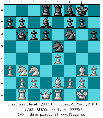 Last move : 1-0 2009 October 14 21:6:16 [Event "FICGS__CHESS__RAPID_A__000067"] [Site "FICGS"] [Date "2009.08.13"] [Round "1"] [White "Soszynski,Marek"] [Black "Lopez,Victor"] [Result "1-0"] [WhiteElo "2009"] [BlackElo "1910"] 1.e4 e5 2.Nf3 d6 3.d4 exd4 4.Nxd4 Nf6 5.Nc3 c6 6.Be2 Be7 7.O-O O-O 8.Bf3 Nbd7 9.Bf4 Ne5 10.Be2 Re8 11.h3 Bf8 12.Bg3 Qb6 13.Rb1 Bd7 14.Re1 Rad8 15.Nb3 h6 16.a3 1-0 This chess game has been lost on time (started : 2009.08.13 0:15:47) Philidor : Exchange variation Kingside Castling by player White (move 7) Kingside Castling by player Black (move 7) Player White won this chess game. Follow this game move after move (download)I am still a victim of Chess. It has all the beauty of art and much more. It cannot be commercialized. Chess is much purer than art in its social position. (Marcel Duchamp) Offensichtlich kennt Kasparow nichts anderes als Schach, und ich könnte 500 weitere Spieler dieser Sorte benennen. (Judith Polgar) Los asuntos humanos son como una partida de Ajedrez: solo aquellos que no lo toman seriamente, pueden ser llamados buenos jugadores. (Hung Tzu Ch'eng) Fischer est le meilleur joueur du monde et Karpov n'est qu'un joueur de bistrot. (Garry Kasparov, agé de 16 ans) The Internet is so big, so powerful and pointless that for some people it is a complete substitute for life. (Andrew Brown)