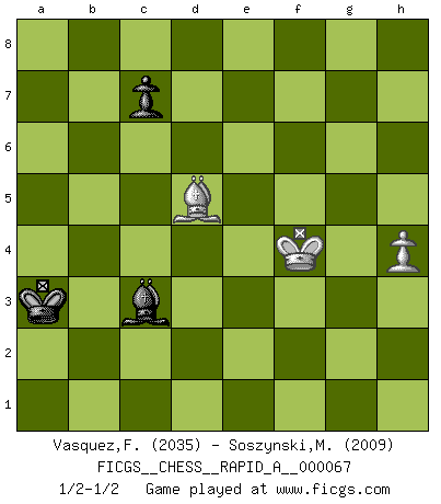 Last move : 1/2-1/2 2009 November 12 7:37:42 [Event "FICGS__CHESS__RAPID_A__000067"] [Site "FICGS"] [Date "2009.08.13"] [Round "1"] [White "Vasquez,Fernando"] [Black "Soszynski,Marek"] [Result "1/2-1/2"] [WhiteElo "2035"] [BlackElo "2009"] 1.e4 e5 2.Nf3 Nc6 3.d4 exd4 4.Nxd4 Nf6 5.Nxc6 bxc6 6.Bd3 d5 7.exd5 cxd5 8.O-O Be7 9.Nc3 O-O 10.h3 Rb8 11.Re1 Re8 12.Rb1 Be6 13.Bb5 Bd7 14.Bd3 Bd6 15.Bg5 h6 16.Bxf6 Qxf6 17.Nxd5 Qg5 18.Rxe8+ Rxe8 19.Qf3 Qe5 20.Kf1 Be6 21.c4 Bxd5 22.cxd5 Qh2 23.g4 Bc5 24.Re1 Rxe1+ 25.Kxe1 Qe5+ 26.Qe2 Qxd5 27.Qe8+ Bf8 28.Qe4 Qxe4+ 29.Bxe4 Bc5 30.Ke2 Kf8 31.f4 Ke7 32.Kf3 Bd4 33.b3 Kd6 34.Bd3 g5 35.Ke4 Bb2 36.Bf1 f6 37.Kf5 a5 38.Bg2 Kc5 39.Bb7 Bc3 40.Kg6 gxf4 41.Kxh6 Be1 42.g5 fxg5 43.Kxg5 Kb4 44.Kxf4 Ka3 45.Bd5 Kxa2 46.b4 Ka3 47.bxa5 Bxa5 48.h4 Bc3 1/2-1/2 Scotch : Schmidt variation Kingside Castling by player White (move 8) Kingside Castling by player Black (move 9) 10 pieces endgame at move 43 : White KBPPP , Black KBPPP WHITE : King + 1 Bishop 3 Pawns BLACK : King + 1 Bishop 3 Pawns 9 pieces endgame at move 44 : White KBPPP , Black KBPP WHITE : King + 1 Bishop 3 Pawns BLACK : King + 1 Bishop 2 Pawns 8 pieces endgame at move 45 : White KBPP , Black KBPP WHITE : King + 1 Bishop 2 Pawns BLACK : King + 1 Bishop 2 Pawns 7 pieces endgame at move 47 : White KBPP , Black KBP WHITE : King + 1 Bishop 2 Pawns BLACK : King + 1 Bishop 1 Pawn 6 pieces endgame at move 47 : White KBP , Black KBP WHITE : King + 1 Bishop 1 Pawn BLACK : King + 1 Bishop 1 Pawn This chess game ended in a draw. Follow this game move after move (download)Fischer wanted to give the Russians a taste of their own medicine. (Larry Evans) Mit Schach schule ich mein Gefühl für Geometrie, was für Tennis und Schach gleichermaßen wichtig ist. (Boris Becker) Vive, pierde y aprende al observar a tu oponente como ganar. (Amber Steenbock) J'apprécie les joueurs d'est-indienne, c'est grâce à eux que je nourris ma famille depuis tant d'années. (Petrosian) Fortune favours the audacious. (Desiderius Erasmus)