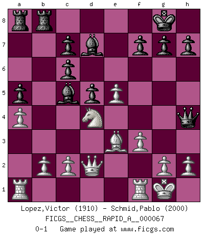 Last move : 0-1 2009 December 5 8:58:36 [Event "FICGS__CHESS__RAPID_A__000067"] [Site "FICGS"] [Date "2009.08.13"] [Round "1"] [White "Lopez,Victor"] [Black "Schmid,Pablo"] [Result "0-1"] [WhiteElo "1910"] [BlackElo "2000"] 1.e4 e5 2.Bc4 Nf6 3.d4 exd4 4.Nf3 Nc6 5.e5 d5 6.Bb5 Ne4 7.Nxd4 Bc5 8.Be3 Bd7 9.Bxc6 bxc6 10.Nd2 Qh4 11.O-O O-O 12.N2b3 Bb6 13.a4 a5 14.f3 Nc5 15.Nxc5 Bxc5 16.Qd2 Rfb8 0-1 This chess game has been lost on time (started : 2009.08.13 0:15:47) Bishop's Opening : Urusov gambit Kingside Castling by player White (move 11) Kingside Castling by player Black (move 11) Player Black won this chess game. Follow this game move after move (download)Mistrust is the most necessary characteristic of the Chess player. (Siegbert Tarrasch) Schach ist gnadenlos. Du mußt bereit sein zu töten. (Nigel Short) La esencia del Ajedrez es pensar acerca de lo que el Ajedrez es. (David Bronstein) Tout change constamment, y compris dans le monde des Echecs. (Botvinnik) There is no instance of a country having benefited from prolonged warfare. (Sun Tzu)