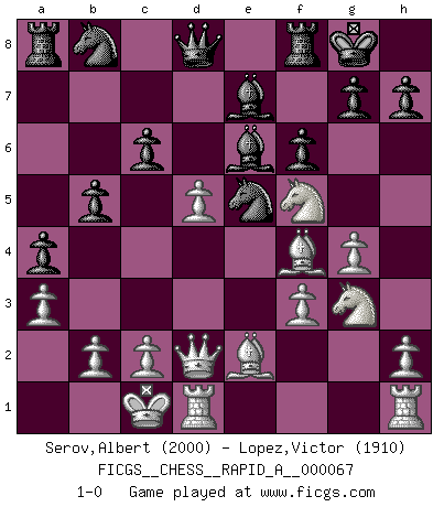 Last move : 1-0 2009 October 18 21:30:54 [Event "FICGS__CHESS__RAPID_A__000067"] [Site "FICGS"] [Date "2009.08.13"] [Round "1"] [White "Serov,Albert"] [Black "Lopez,Victor"] [Result "1-0"] [WhiteElo "2000"] [BlackElo "1910"] 1.e4 e5 2.Nf3 d6 3.d4 exd4 4.Nxd4 Nf6 5.Nc3 Be7 6.Bf4 c6 7.Qd2 O-O 8.O-O-O b5 9.f3 a5 10.g4 a4 11.Nce2 Nfd7 12.Nf5 Ne5 13.Neg3 Be6 14.Be2 f6 15.a3 d5 16.exd5 1-0 This chess game has been lost on time (started : 2009.08.13 0:15:47) Philidor : Exchange variation Kingside Castling by player Black (move 7) Queenside Castling by player White (move 8) Player White won this chess game. Follow this game move after move (download)He who fears an isolated Queen's Pawn should give up Chess. (Siegbert Tarrasch) Als er Schachweltmeister wurde ließ er praktisch alle stärksten Sovietspieler für sich arbeiten. Wenn ein auch nur mittelmässiger Meister ein Spezialist für eine bestimmte Eröffnung war, wurde er von Karpov gerufen. Das wurde alles geheim gehalten. (Mikhail Moiseyevich Botvinik) Me siento como si fuera una pieza en una partida de Ajedrez, cuando mi oponente me indica: esa pieza no puede ser movida. (Soren Kierkegaard) Le moment que je préfère le plus dans une rencontre, c'est celui où je sens que la personnalité de l'adversaire se brise. (Robert Fischer) The meaning of life is that it is to be lived, and it is not to be traded and conceptualized and squeezed into a pattern of systems. (Bruce Lee)