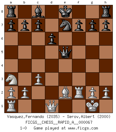 Last move : 1-0 2009 December 6 9:17:56 [Event "FICGS__CHESS__RAPID_A__000067"] [Site "FICGS"] [Date "2009.08.13"] [Round "1"] [White "Vasquez,Fernando"] [Black "Serov,Albert"] [Result "1-0"] [WhiteElo "2035"] [BlackElo "2000"] 1.e4 e5 2.Nf3 Nc6 3.d4 exd4 4.Nxd4 Bc5 5.Be3 Qf6 6.c3 Nge7 7.Bc4 Ne5 8.Be2 Qg6 9.O-O d6 10.f4 Qxe4 11.Bf2 Bxd4 12.fxe5 Bxf2+ 13.Rxf2 Qxe5 14.Na3 1-0 Scotch game Kingside Castling by player White (move 9) Player White won this chess game. Follow this game move after move (download)Many have become Chess Masters, no one has become the Master of Chess. (Siegbert Tarrasch) Pläne sind die Träume des Verständigen. (Ernst Freiherr von Feuchtersleben) Yo tuve un dolor de muelas en la primer partida. En el segundo juego, tuve un dolor de cabeza. En el tercero, tuve un ataque de reumatísmo. En la cuarta partida, no me sentía muy bien. ¿Y en el quinto juego? Bueno, ¿que acaso uno tiene que ganar todos los juegos?. (Siegbert Tarrasch) Les échecs c'est le défi de l'alpiniste, toujours plus haut, prêt à tout pour monter à l'assaut du Roi ennemi. Les échecs, c'est de la musique en mouvement, un ballet majestueux pour les yeux. C'est de la poésie composée par les fantômes du passé qui au même titre que Rimbaud ou Verlaine méritent notre admiration. Les échecs, c'est de la peinture ou le moindre mouvement modifie le tableau pour en faire un Picasso ou un Van Gogh. Les échecs, c'est tout et rien, c'est la vie et la mort. Jjulie33 sur le forum de France-Echecs. When you don't know what to do, walk fast and look worried. (Anonymous)
