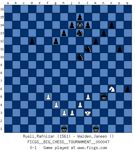 Last move : 0-1 2010 May 1 7:39:35 [Event "FICGS__BIG_CHESS__TOURNAMENT__000047"] [Site "FICGS"] [Date "2009.08.13"] [Round "1"] [White "Rusli,Rafnizar"] [Black "Walden,Janeen"] [Result "0-1"] [WhiteElo "1561"] [BlackElo ""] 1.j2-k4 h15-g13 2.h1-o7 m15-m13 3.o7-c7 j15-k13 4.h2-g4 e15-e13 5.m2-m4 p16-o14 6.l1-p5 k16-h15 7.d2-d4 l16-o13 8.c1-l9 b16-c14 9.b1-c3 f16-b12 10.c7-o7 n15-n14 11.n2-n4 d15-d14 12.g1-j2 c16-k9 13.e2-e4 g16-f14 14.o1-d11 e13-e12 15.d11-f9 l15-l14 16.o7-b7 a15-a13 17.f9-b13 e16-e13 18.b13-e10 h16-j15 19.p1-n2 c14-d12 20.e10-c12 b15-b13 21.c12-a10 o16-f8 22.l9-g13 h15-g13 23.p5-g13 e13-g13 24.a10-f15 a16-f16 25.f15-o7 g13-g7 26.b7-d9 g7-o7 27.d9-d12 o7-o2 28.k1-l3 o2-p2 29.n2-p3 m13-m12 30.m1-o1 m16-m13 31.g4-h2 j15-l13 32.d12-f10 b12-c13 33.f10-g10 l13-g9 34.f1-b5 g9-g10 35.b5-g10 k9-j8 36.g10-f9 c13-m4 37.h2-k3 m4-c13 38.j1-k1 p2-o2 39.f9-b13 f16-b16 40.b13-g8 m13-n13 41.a1-b1 o2-o1 42.q1-o1 j16-j15 43.f2-f3 b16-b8 44.g8-m3 q16-b16 45.b2-b3 b8-c8 46.e1-e3 b16-b11 47.b1-c1 f8-h6 48.c1-e1 h6-e3 49.e1-e3 b11-c11 50.c3-d5 c8-c2 51.j2-h4 c2-a2 52.k1-j2 n13-n10 53.e3-e1 n10-b10 54.b3-b4 c11-c2 55.j2-h2 j8-h9 56.o1-o9 h9-d5 57.e4-d5 b10-b4 58.o9-p9 p15-p14 59.p9-o9 b4-d4 60.m3-g8 d4-d2 61.k3-j1 o14-m13 62.k4-h5 m13-l11 63.h5-f6 c13-a11 64.f6-e4 d2-e2 65.e1-b1 c2-b2 66.b1-c1 e2-c2 67.c1-e1 g15-g13 68.e4-g3 c2-c9 69.o9-o6 c9-q9 70.o6-o2 a2-a8 71.g8-f7 a8-q8 72.e1-c1 c15-c13 73.c1-a1 a11-b12 74.f7-k3 q8-q2 75.o2-o6 q9-q10 76.k3-l4 d14-d13 77.o6-f6 f14-h13 78.f6-f13 d13-d12 79.a1-e1 e12-e11 80.f13-f15 j15-k14 81.l4-m3 b2-d2 82.m3-g8 q10-g10 83.g8-e6 h13-f12 84.f15-f16 q2-p2 85.p3-n2 o13-h7 86.n2-o4 p2-o2 87.o4-m5 o2-o1 88.e1-c1 q15-q13 89.f16-o16 h7-g8 90.f3-f4 g8-e6 91.d5-e6 g10-d10 92.c1-c8 d10-o10 93.j1-k3 o1-o2 94.k3-m4 q13-q12 95.c8-k8 q12-q11 96.k8-q8 q11-q10 97.o16-q16 d2-d10 98.q16-q11 n14-n13 99.q8-n8 o15-o14 100.q11-p11 p14-p13 101.p11-p6 a13-a12 102.p6-k6 a12-a11 103.n8-h8 h14-h13 104.h8-g8 g13-g12 105.g8-f8 f12-h11 106.f4-f5 p13-p12 107.m5-n7 p12-p11 108.n7-o5 d10-k10 109.f8-k8 k10-k8 110.k6-k8 o10-k10 111.k8-k10 h11-k10 112.g3-e4 a11-a10 113.h4-f3 a10-a9 114.f3-d4 a9-a8 115.d4-b5 b12-d10 116.b5-c7 a8-a7 117.e4-c5 o2-o1 118.c7-b9 o1-c1 119.c5-d7 a7-a6 120.b9-d10 e11-d10 121.m4-k5 a6-a5 122.d7-b6 c1-b1 123.b6-a4 b1-b4 124.a4-c5 a5-a4 125.c5-d3 b4-d4 126.d3-c5 a4-a3 127.k5-h4 a3-a2 128.k2-k4 a2-a1 129.h2-j2 a1-a7 130.c5-d7 d4-d7 131.e6-d7 a7-d7 132.o5-n3 c13-c12 133.n3-m5 c12-c11 134.l3-k5 c11-c10 135.g2-g4 c10-c9 136.h4-g6 c9-c8 137.k5-h4 c8-c7 138.h4-f3 c7-c6 139.f3-e5 d7-d2 140.j2-k3 c6-c5 141.e5-c4 d2-c1 142.g6-e5 q10-q9 143.l2-l4 q9-q8 144.l4-l5 q8-q7 145.m5-o6 q7-q6 146.c4-d6 c1-j1 147.o6-q5 j1-e5 148.d6-c4 e5-e2 149.c4-d6 e2-d1 150.d6-e4 d1-h1 151.k3-j4 h1-e4 152.n4-n5 c5-c4 153.q5-o6 c4-c3 154.j4-h4 c3-c2 155.h4-j4 c2-c1 156.j4-h4 d10-d9 157.h4-j4 d9-d8 158.j4-h4 d8-d7 159.h4-j4 d7-d6 160.j4-h4 d6-d5 161.h4-j4 d5-d4 162.j4-h4 d4-d3 163.h4-j4 d3-d2 164.j4-h4 d2-d1 165.h4-j4 d1-m1 166.j4-k5 c1-k8 167.k5-l4 e4-h1 168.l4-l3 k8-n5 0-1 This big chess game has been lost on time (started : 2009.08.13 23:59:42) Follow this game move after move (download)Chess is above all, a fight ! (Emanuel Lasker) Ein bischen Romantik kann weder im Schach noch in der Liebe schaden. Also versuche ich mich ab und zu daran zu erinnern. (Nigel Short) Aquellos que dicen que entienden al Ajedrez, no entienden nada. (Robert Hubner) Donnez-moi un Cavalier en 6e et je gagnerais toutes mes parties. (Steinitz) The arrogant army will lose certainly the battle. (Chinese proverb)