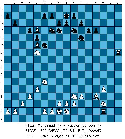 Last move : 0-1 2009 November 26 8:48:10 [Event "FICGS__BIG_CHESS__TOURNAMENT__000047"] [Site "FICGS"] [Date "2009.08.13"] [Round "1"] [White "Nizar,Muhammad"] [Black "Walden,Janeen"] [Result "0-1"] [WhiteElo ""] [BlackElo ""] 1.j2-k4 h15-g13 2.h1-o7 m15-m13 3.o7-c7 j15-k13 4.c7-c15 h16-o10 5.c15-f12 o10-o2 6.m2-m4 o2-o13 7.b1-c3 e15-e13 8.f12-f6 b16-c14 9.l1-p5 k16-h15 10.d2-d4 f16-c13 11.e2-e4 c13-m4 12.p1-o3 m4-d12 13.c1-l9 g16-f14 14.f1-d3 d15-d14 15.e4-e5 c16-k9 16.d3-k9 o13-k9 17.e1-e4 l16-o13 18.a1-e1 n15-n14 19.e4-e2 p16-o14 20.n2-n4 o16-g9 21.o1-d11 e13-e12 22.d11-c12 d14-d13 23.c12-j6 m16-m14 24.l9-k10 o13-p14 25.k10-o14 p15-o14 26.f6-o14 j16-j15 27.o14-g7 q16-p16 28.m1-m9 k9-k12 29.g7-b7 b15-b14 30.m9-m5 c14-e13 31.c3-e4 e13-f11 32.c2-c3 a16-c16 33.q1-m1 c16-c11 34.e4-f6 e16-c16 35.h2-g4 p14-j8 36.m5-o5 j8-n4 37.o5-o15 n4-o3 38.p2-o3 p16-p5 39.o15-q15 c16-o16 40.k1-m2 p5-p2 41.j6-k7 k12-j13 42.k7-l6 j13-m10 43.l6-m5 o16-o8 44.g1-j2 o8-m8 45.l2-l4 m10-p7 46.b7-p7 p2-p7 47.m1-n1 c11-c8 48.j1-h2 p7-p2 49.e1-m1 m8-n8 50.m5-n4 n8-q8 51.q15-q8 c8-q8 52.n1-q1 q8-q2 53.q1-q2 p2-q2 54.g4-j5 n14-n13 55.k2-k3 m14-p14 56.o3-o4 q2-o2 57.o4-o5 p14-q14 58.m2-o3 h15-k14 59.j5-h7 g9-e11 60.e2-e1 f14-h13 61.m1-q1 q14-q1 62.e1-q1 l15-l14 63.h7-f8 k14-l12 64.f8-e10 d12-b10 65.q1-q10 b10-e13 0-1 This big chess game has been lost on time (started : 2009.08.13 23:59:42) Follow this game move after move (download)In complicated positions, Bobby Fischer hardly had to be afraid of anybody. (Paul Keres) Wer nie einen Fehler gemacht hat, hat nie etwas Neues ausprobiert. (Albert Einstein) El Ajedrez es un juego de pelea el cual es puramente intelectual e incluye la suerte. (Richard Reti) Le plus grand jeu de l'esprit jamais inventé, plus vous l'apprenez, plus vous y prenez du plaisir. (Garry Kasparov) Fame, I have already. Now I need the money. (an elderly Steinitz)
