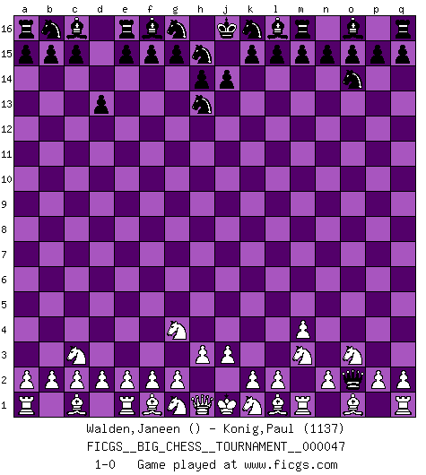 Last move : 1-0 2009 September 14 3:55:21 [Event "FICGS__BIG_CHESS__TOURNAMENT__000047"] [Site "FICGS"] [Date "2009.08.13"] [Round "1"] [White "Walden,Janeen"] [Black "Konig,Paul"] [Result "1-0"] [WhiteElo ""] [BlackElo "1137"] 1.j2-k4 p16-o14 2.h2-g4 j15-h13 3.b1-c3 h16-o10 4.m2-m4 o10-o2 5.p1-o3 d15-d13 6.k4-m3 1-0 Follow this game move after move (download)At this time Fischer is simply a level above all the best Chessplayers in the world. (John Jacobs) Obwohl ich vom Stil her kaum zu den Priestern der Schachkunst gezählt werde, halte ich Schach doch für eine Kunst. (Tigran Petrosjan) Nunca nadie ha ganado una partida de Ajedrez rindiendose. (Unknown) La solitude du joueur d'Echecs à l'approche du mat est semblable à celle du condamné. (Francis Szpiner) Experiences are the keys to life. (Daniel Parmet)