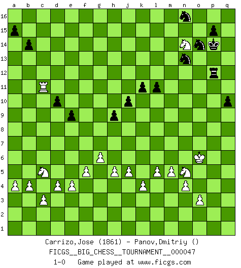 Last move : 1-0 2009 September 8 1:11:18 [Event "FICGS__BIG_CHESS__TOURNAMENT__000047"] [Site "FICGS"] [Date "2009.08.13"] [Round "1"] [White "Carrizo,Jose"] [Black "Panov,Dmitriy"] [Result "1-0"] [WhiteElo "1861"] [BlackElo ""] 1.j2-k4 p16-o14 2.h1-o7 h15-g13 3.o7-c7 k15-k14 4.c7-c15 b16-c14 5.c15-o4 g16-f14 6.c2-c3 d15-d13 7.n2-n4 e15-e13 8.o2-o3 f16-c13 9.m2-m4 n15-n14 10.l1-n3 m15-m13 11.d2-d4 o16-g9 12.l2-l4 l15-l13 13.l4-l5 k14-k13 14.p1-n2 j14-j13 15.n2-l3 k16-l14 16.e2-e4 l16-c8 17.g2-g4 h14-h13 18.f2-f4 l13-l12 19.f4-f5 h13-h12 20.b1-d2 f14-h13 21.d2-b3 f15-f13 22.b3-c5 f13-f12 23.b2-b4 k13-k12 24.a2-a4 j15-k13 25.c1-f4 j13-j12 26.k4-h5 g13-e12 27.k2-k4 g15-g13 28.h3-h4 g13-g12 29.g1-h3 g12-g11 30.h3-g5 k12-k11 31.j1-k2 j16-k15 32.j3-j4 k15-l15 33.g5-h7 g9-k12 34.h5-k6 e16-g16 35.h2-f3 m16-j16 36.k1-j3 l15-m15 37.f1-h3 m15-n15 38.j4-j5 q16-k16 39.g4-g5 n15-o16 40.q2-q4 j12-j11 41.q4-q5 h12-h11 42.q5-q6 g11-g10 43.o1-k5 h11-h10 44.q6-q7 f12-f11 45.q7-q8 b15-b14 46.q8-q9 c16-b15 47.q9-q10 a16-f16 48.q10-q11 e12-g11 49.q11-q12 e13-e12 50.q12-q13 q15-q14 51.g5-g6 o14-n16 52.q1-q5 j11-j10 53.q5-o5 l14-m16 54.m1-q1 d13-d12 55.q1-q10 e12-e11 56.q10-o10 f16-f15 57.h7-k8 f11-f10 58.k5-c12 g16-g15 59.c12-f15 g15-f15 60.h3-q11 k16-k15 61.e1-q1 c14-e13 62.k8-m9 d12-d11 63.m9-n11 e11-e10 64.q1-q8 k12-l13 65.q8-c8 l13-n11 66.f3-g5 n11-o10 67.o5-o10 d11-d10 68.c8-o8 h13-j11 69.g5-h7 e10-e9 70.o4-n5 h16-h14 71.n3-q6 e13-g12 72.a1-q1 h14-l14 73.q1-q5 f10-f9 74.q5-o5 j16-j15 75.o8-n8 k15-n15 76.q6-m10 o15-o13 77.l3-m5 c13-f16 78.k6-m7 f16-m10 79.f4-m10 n16-o14 80.m10-k12 k13-m14 81.m7-n9 g11-h13 82.k12-l11 o14-n12 83.o10-o11 n12-l11 84.o11-l11 m14-n12 85.l11-l7 g10-g9 86.n9-o11 m16-o15 87.o11-q12 o15-n13 88.l7-p7 h13-k12 89.h7-k8 k12-m11 90.k8-m9 b15-l6 91.n8-q8 l6-q11 92.q8-q11 l14-m14 93.m9-n11 n15-o15 94.m5-n7 j11-l10 95.n7-m9 l10-n11 96.m9-n11 g12-j13 97.k2-k3 l12-l11 98.h4-h5 j13-l12 99.n11-l12 m13-l12 100.o5-o7 j15-n15 101.o7-c7 f15-m15 102.m4-m5 m11-o12 103.q11-q8 o12-q13 104.c7-c16 n15-n16 105.p7-c7 q13-o14 106.q8-c8 m15-m16 107.c8-c14 m14-j11 108.c16-m16 n16-m16 109.c14-n14 n13-m11 110.q12-o13 h10-h9 111.n5-f12 j11-p5 112.f12-f10 m16-n16 113.f10-g9 m11-l13 114.n14-n16 o14-n16 115.o13-m12 o16-p16 116.c7-c16 o15-o16 117.g9-f9 n12-o14 118.f9-k13 l13-m15 119.k13-l12 p16-q16 120.m12-n14 o16-p16 121.n14-m16 p5-p2 122.m16-o15 q16-q15 123.l12-m11 p2-p14 124.m11-p14 q15-p14 125.o15-m16 p16-q16 126.m16-n14 q14-q13 127.k3-l4 q13-q12 128.l4-m4 q12-q11 129.m4-n5 q11-q10 130.n5-o6 m15-n13 131.j3-l4 q16-q12 132.l4-n5 q12-p12 133.c16-c11 1-0 Follow this game move after move (download)In a gambit you give up a Pawn for the sake of getting a lost game. (Samuel Standige Boden) Sehr viele beherrschen heutzutage das große Einmalseins des Schachspiels und kennen sogar dessen Logarithmentafeln auswendig - deshalb sollte man hin und wieder zu beweisen trachten, dass zwei mal zwei auch fünf sein kann. (Mikhail Nekhemyevich Tal) Ser exitoso en el Ajedrez te permite descubrir tu propia personalidad. Eso es lo que deseo para los niños de mi clase. (Saudin Robovic) D'abord les bases : Jouez et étudiez, puis étudiez et jouez, ensuite jouez et étudiez, puis étudiez et jouez. Deuxièmement : Donnez toujours le meilleur de vous-même ! (Ken Smith) Computer Science is no more about computers than astronomy is about telescopes. (Edsger W. Dijkstra)
