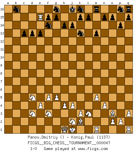 Last move : 1-0 2009 November 8 8:20:28 [Event "FICGS__BIG_CHESS__TOURNAMENT__000047"] [Site "FICGS"] [Date "2009.08.13"] [Round "1"] [White "Panov,Dmitriy"] [Black "Konig,Paul"] [Result "1-0"] [WhiteElo ""] [BlackElo "1137"] 1.p1-o3 j15-k13 2.k1-l3 h16-o10 3.h3-h4 o10-c10 4.b1-c3 c10-l2 5.k2-k3 l2-o5 6.n2-n4 o5-j10 7.d2-d3 p15-p14 8.e2-e4 d15-d13 9.m2-m4 m15-m13 10.f2-f4 o16-p15 11.g2-g4 l16-p12 12.f1-e2 e15-e13 13.g4-g5 p12-e2 14.g1-e2 f16-b12 15.f4-f5 j10-o10 16.j3-j4 p15-e5 17.c1-f4 e5-f4 18.e2-f4 o10-l10 19.l1-k2 c16-n6 20.m4-m5 n6-p4 21.o1-n2 l10-n8 22.q2-q3 p4-o3 23.n2-o3 n8-b8 24.c3-d5 b8-b2 25.a1-b1 b2-c2 26.b1-b12 c2-a2 27.b12-b15 e16-e15 28.e1-a1 a2-d2 29.a1-a15 a16-a15 30.b15-a15 h15-f14 31.h2-f3 d2-d3 32.f4-d3 c15-c13 33.a15-e15 1-0 This big chess game has been lost on time (started : 2009.08.13 23:59:42) Follow this game move after move (download)Examine moves that smite! A good eye for smites is far more important than a knowledge of strategical principles. (Purdy) Privat ist Kortschnoi kein schlechter Mensch, sehr sympathisch. Aber während des Spiels ist er grausam. Er will dich töten. (Miguel Najdorf) Las piezas de Ajedrez son los bloques del alfabeto que moldean los pensamientos; y esos pensamientos, aunque hagan un diseño visual en el tablero, expresan abstractamente su belleza como un poema. (Marcel Duchamp) La tactique, c'est ce que vous faites quand il y a quelque chose à faire; la stratégie, c'est ce que vous faites quand il n'y a rien à faire. (Savielli Tartacower) Life is painting a picture, not doing a sum. (Oliver Wendell Holmes, Jr.)