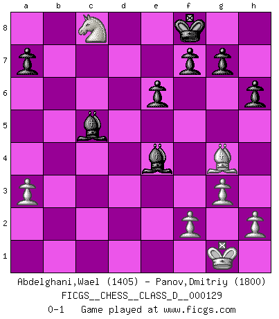 Last move : 0-1 2009 November 25 13:4:34 [Event "FICGS__CHESS__CLASS_D__000129"] [Site "FICGS"] [Date "2009.08.14"] [Round "1"] [White "Abdelghani,Wael"] [Black "Panov,Dmitriy"] [Result "0-1"] [WhiteElo "1405"] [BlackElo "1800"] 1.Nf3 Nf6 2.g3 b6 3.Bg2 Bb7 4.O-O e6 5.d4 Be7 6.c4 O-O 7.Nc3 d5 8.b3 c5 9.e3 dxc4 10.bxc4 Nbd7 11.Qe2 Ne4 12.Nxe4 Bxe4 13.Rd1 Qc7 14.Bb2 Rac8 15.Rac1 Rfd8 16.Bh3 Qb7 17.Nd2 Bc6 18.Bg4 Qa6 19.Nf3 h6 20.Ne1 cxd4 21.exd4 Ba4 22.Rd3 Rxc4 23.Rdc3 b5 24.Rxc4 bxc4 25.Qxc4 Bb5 26.Qb3 Nb6 27.a3 Bc4 28.Qf3 Bd5 29.Qd3 Qxd3 30.Nxd3 Na4 31.Rc7 Nxb2 32.Nxb2 Bf6 33.Nd3 Bxd4 34.Nb4 Be4 35.Nc6 Bb6 36.Rc8 Rxc8 37.Ne7+ Kf8 38.Nxc8 Bc5 0-1 Reti Opening Kingside Castling by player White (move 4) Kingside Castling by player Black (move 6) Player Black won this chess game. Follow this game move after move (download)There is no remorse like the remorse of Chess. (H. G. Wells) Das Schachspiel ist ein See, in welchem eine Mücke baden und ein Elefant ertrinken kann. (Emanuel Lasker) El jugador blanco perdió porque fallo en recordar la coreccta continuación y tuvo que pensar por sí mismo las movidas. (Siegbert Tarrasch) Il n'y a pas de prix trop élevé au scalp de l'ennemi. (Koblentz) Good decisions come from experience, and experience comes from bad decisions. (Anonymous)