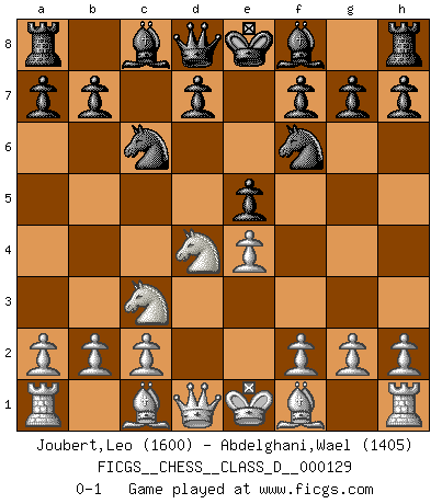 Last move : 0-1 2009 September 23 21:42:45 [Event "FICGS__CHESS__CLASS_D__000129"] [Site "FICGS"] [Date "2009.08.14"] [Round "1"] [White "Joubert,Leo"] [Black "Abdelghani,Wael"] [Result "0-1"] [WhiteElo "1600"] [BlackElo "1405"] 1.e4 c5 2.Nf3 Nc6 3.d4 cxd4 4.Nxd4 Nf6 5.Nc3 e5 0-1 This chess game has been lost on time (started : 2009.08.14 15:54:22) Sicilian : Pelikan (Lasker/Sveshnikov) variation Player Black won this chess game. Follow this game move after move (download)No one ever won a game by resigning. (Unknown) Ich verachte Kasparow. (Viktor Kortschnoi) Los asuntos humanos son como una partida de Ajedrez: solo aquellos que no lo toman seriamente, pueden ser llamados buenos jugadores. (Hung Tzu Ch'eng) Le génie consiste à savoir transgresser les règles au moment opportun. (Teichmann) When a man with money meets a man with experience, the man with experience leaves with money and the man with money leaves with experience. (Anonymous)