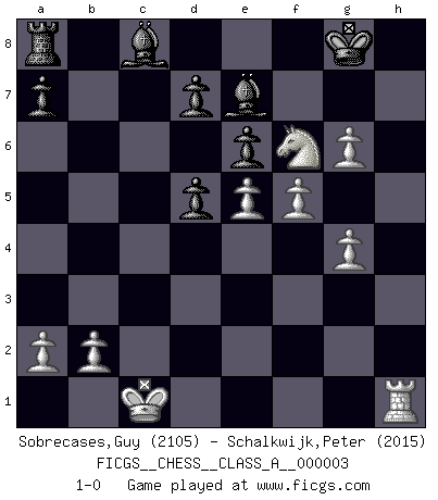 Last move : 1-0 2006 June 18 20:15:45 [Event "FICGS__CHESS__CLASS_A__000003"] [Site "FICGS"] [Date "2006.04.22"] [Round "1"] [White "Sobrecases,Guy"] [Black "Schalkwijk,Peter"] [Result "1-0"] [WhiteElo "2105"] [BlackElo "2015"] 1.e4 c5 2.Nf3 Nf6 3.e5 Nd5 4.c4 Nc7 5.d4 cxd4 6.Nxd4 e6 7.Nc3 Bb4 8.Qg4 O-O 9.Bg5 Be7 10.h4 f6 11.f4 fxg5 12.hxg5 g6 13.Bd3 Qe8 14.Rxh7 Kxh7 15.Qh5+ Kg7 16.Qh6+ Kg8 17.Bxg6 Rf7 18.Ne4 Nc6 19.O-O-O Qf8 20.Nxc6 bxc6 21.Qh5 Qg7 22.Bxf7+ Qxf7 23.g6 Qg7 24.g4 Nd5 25.cxd5 cxd5 26.f5 Qh8 27.Qxh8+ Kxh8 28.Rh1+ Kg8 29.Nf6+ 1-0 Sicilian : Nimzovich-Rubinstein variation Kingside Castling by player Black (move 8) Queenside Castling by player White (move 19) Player White won this chess game. Follow this game move after move (download)Combinations have always been the most intriguing aspect of Chess. The masters look for them, the public applauds them, the critics praise them. It is because combinations are possible that Chess is more than a lifeless mathematical exercise. They are the poetry of the game; they are to Chess what melody is to music. They represent the triumph of mind over matter. (Reuben Fine) Du musst nicht gut spielen, es reicht, wenn du besser spielst als dein Gegner. (Anonymous) Todos los Maestros de Ajedrez fueron un día unos principiantes. (Chernev) Les Echecs ne sont pas pour les âmes timides. Ils requièrent un homme entier, qui ne s'arrête pas aveuglément à ce qui a été déjà établi, mais qui tente individuellement de sonder les profondeurs du jeu. (W. Steinitz) At last I discovered the true beauty of chess. So I proposed to her. (Dinesh De Silva)