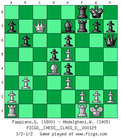 Last move : 1/2-1/2 2009 August 19 16:57:39 [Event "FICGS__CHESS__CLASS_D__000129"] [Site "FICGS"] [Date "2009.08.14"] [Round "1"] [White "Fappiano,Giuseppe"] [Black "Abdelghani,Wael"] [Result "1/2-1/2"] [WhiteElo "1800"] [BlackElo "1405"] 1.d4 Nf6 2.Nf3 d5 3.e3 e6 4.Bd3 Be7 5.Nbd2 O-O 6.c3 b6 7.O-O Bb7 8.Re1 Ne4 9.Qc2 f5 10.c4 Nd7 11.b3 Qe8 12.Bb2 Qh5 13.Be2 Qh6 14.Nxe4 fxe4 15.Ne5 Nxe5 16.dxe5 Rf7 17.cxd5 Bxd5 18.Bc4 Raf8 19.Rf1 c6 20.Bxd5 cxd5 21.Bd4 Rf5 22.Qc7 R5f7 23.Qc2 Rf5 24.Qc7 R5f7 1/2-1/2 Queen's pawn game Kingside Castling by player Black (move 5) Kingside Castling by player White (move 7) This chess game ended in a draw. Follow this game move after move (download)No price is too great for the scalp of the enemy King. (Koblentz) Zum Sieg gelangt man nicht, wenn man gut, sondern nur wenn man besser spielt (Savielly Grigorievitsch Tartakower) Si pudieramos observar el interior de la cabeza de un jugador de Ajedrez, encontraríamos ahí un mundo lleno de sentimientos, imágenes, ideas, emoción y pasión. (Alfred Binet) On croit qu'il y a plus de mauvais joueurs que de bons joueurs, c'est faux : Il y a autant de joueurs qui gagnent que de joueurs qui perdent. (Philippe Geluck) Secret operations are essential in war; upon them the army relies to make its every move. (Sun Tzu)