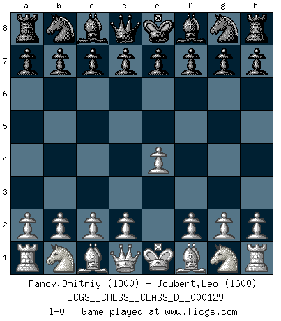 Last move : 1-0 2009 October 4 20:52:1 [Event "FICGS__CHESS__CLASS_D__000129"] [Site "FICGS"] [Date "2009.08.14"] [Round "1"] [White "Panov,Dmitriy"] [Black "Joubert,Leo"] [Result "1-0"] [WhiteElo "1800"] [BlackElo "1600"] 1.e4 1-0 This chess game has been lost on time (started : 2009.08.14 15:54:22) King's pawn Opening Player White won this chess game. Follow this game move after move (download)Chess teaches you to control the initial excitement you feel when you see something that looks good and it trains you to think objectively when you're in trouble. (Stanley Kubrick) Ich habe die Schachforschung dermaßen betrieben, dass sie auf eine wissenschaftliche Basis gestellt wurde. (Mikhail Moiseyevich Botvinik) El hombre es un frívolo, una creatura engañosa y como un jugador de Ajedrez, se preocupa mas por el proceso de obtener su meta que de la meta por sí misma. (Dostoyevsky) La menace est plus forte que l'exécution. (Aaron Nimzovitch) There are 10 types of people in this world: those who understand binary and those who don't. (Anonymous)