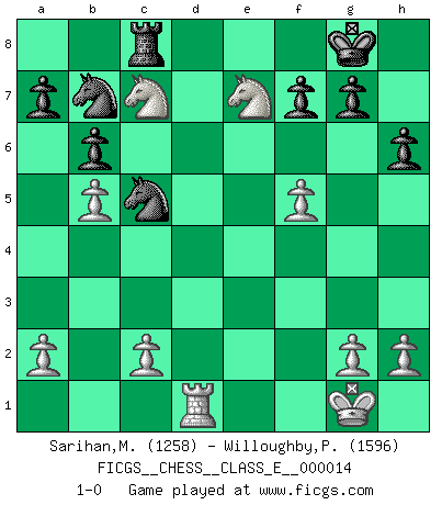 Last move : 1-0 2007 January 8 20:59:18 [Event "FICGS__CHESS__CLASS_E__000014"] [Site "FICGS"] [Date "2006.09.23"] [Round "1"] [White "Sarihan,Mustafa"] [Black "Willoughby,Peter"] [Result "1-0"] [WhiteElo "1258"] [BlackElo "1596"] 1.d4 e6 2.e4 d5 3.exd5 exd5 4.Nf3 c5 5.dxc5 Bxc5 6.Bb5+ Bd7 7.Bxd7+ Qxd7 8.O-O Nf6 9.Re1+ Ne4 10.Be3 O-O 11.Bxc5 Nxc5 12.Nc3 Rd8 13.Qxd5 Qxd5 14.Nxd5 Nc6 15.Rad1 b6 16.b4 Ne6 17.b5 Na5 18.Ne5 h6 19.f4 Nb7 20.Nc6 Rd6 21.f5 Nec5 22.Nc7 Rxd1 23.Rxd1 Rc8 24.Ne7+ 1-0 Queen's pawn Kingside Castling by player White (move 8) Kingside Castling by player Black (move 10) Player White won this chess game. Follow this game move after move (download)A great player and a great example for many. His book My 60 Memorable Games had a big impact on me. It is a shame he didn't continue to enrich the world of chess with his unparalleled understanding after 1972. (Jan Timman, about Bobby Fischer's death) Nach Morphy wurde nichts neues mehr in der Behandlung offener Positionen gefunden. (Mikhail Moiseyevich Botvinik) Aún el Rey más flojo huye despavorido ante la amenaza de un Jaque doble. (Aaron Nimzowitsch) A chaque perte on perd un peu de soi. (Joël Lautier) Hello Thibault, if I have had a plan (and I had one, I hope), I have forgotten it during the last week... - Hello Heinz-Georg. What do you mean a plan ? (Anonymous players, during a Big Chess game)