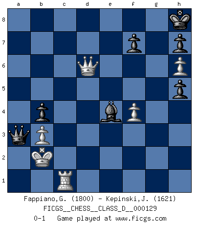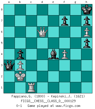 Last move : 0-1 2009 October 18 11:42:16 [Event "FICGS__CHESS__CLASS_D__000129"] [Site "FICGS"] [Date "2009.08.14"] [Round "1"] [White "Fappiano,Giuseppe"] [Black "Kepinski,Janusz"] [Result "0-1"] [WhiteElo "1800"] [BlackElo "1621"] 1.d4 g6 2.e4 d6 3.Nc3 Bg7 4.Be3 Nf6 5.f3 O-O 6.Qd2 c6 7.O-O-O b5 8.g4 b4 9.Nce2 Qa5 10.Kb1 c5 11.Nc1 cxd4 12.Bxd4 Bb7 13.Bc4 e5 14.Be3 Nc6 15.Nb3 Qc7 16.Ne2 a5 17.h4 a4 18.Nbc1 Nd4 19.Nxd4 exd4 20.Bxd4 Qxc4 21.b3 axb3 22.cxb3 Qb5 23.h5 Rfc8 24.h6 Bh8 25.g5 Nh5 26.Bxh8 Kxh8 27.Qxd6 Qxg5 28.Rxh5 gxh5 29.f4 Bxe4+ 30.Ka1 Rxc1+ 31.Rxc1 Rxa2+ 32.Kxa2 Qa5+ 33.Kb2 Qa3+ 0-1 Modern defense Kingside Castling by player Black (move 5) Queenside Castling by player White (move 7) Player Black won this chess game. Follow this game move after move (download)Place the contents of the Chess box in a hat, shake them up vigorously, pour them on the board from a height of two feet, and you get the style of Steinitz. (H. E. Bird) Wer der Ansicht ist, daß alle Schachspieler verrückt sind, wird durch Studium des Lebens von Emil Josef Diemer nicht auf andere Gedanken kommen. (Hans Ree) La mitad de las variaciones que son calculadas en una partida de torneo, resultan ser completamente superfluas. Desafortunadamente, nadie sabe por adelantado cual mitad. (Jan Tinman) Les échecs, c'est l'art d'analyser. (Mikhail Botvinnik) Chess, like love, like music, has the power to make people happy. (Siegbert Tarrasch)