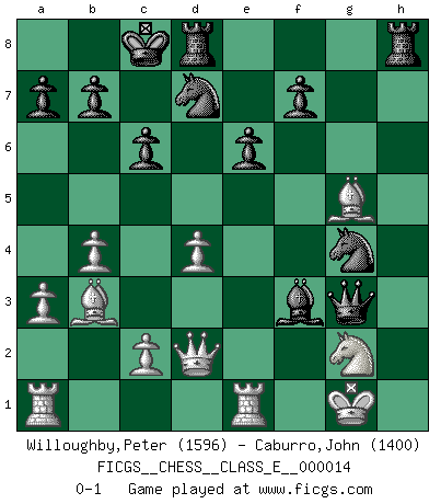 Last move : 0-1 2006 October 1 10:40:43 [Event "FICGS__CHESS__CLASS_E__000014"] [Site "FICGS"] [Date "2006.09.23"] [Round "1"] [White "Willoughby,Peter"] [Black "Caburro,John"] [Result "0-1"] [WhiteElo "1596"] [BlackElo "1400"] 1.e4 d5 2.exd5 Qxd5 3.Nc3 Qa5 4.d4 c6 5.Bc4 Bf5 6.Bd2 Qc7 7.Nf3 e6 8.O-O Nf6 9.Re1 Bd6 10.g3 Nbd7 11.a3 O-O-O 12.b4 h5 13.Ne2 h4 14.Nf4 hxg3 15.fxg3 Bg4 16.Bb3 g5 17.Ng2 Bxg3 18.hxg3 Qxg3 19.Bxg5 Bxf3 20.Qd2 Ng4 0-1 Comment by player 1 : Peter Willoughby : hi again good luck Scandinavian (centre counter) defense Kingside Castling by player White (move 8) Queenside Castling by player Black (move 11) Player Black won this chess game. Follow this game move after move (download)By the beauty of his games, the clarity of his play, and the brilliance of his ideas, Fischer made himself an artist of the same stature as Brahms, Rembrandt, and Shakespeare. (David Levy) Ein Remis kann durch Wiederholung von drei Zügen oder durch einen schlechte Zug erreicht werden. (Savielly Grigorievitsch Tartakower) Todavía soy una víctima del Ajedrez. Tiene toda la belleza del arte y mucho mas. No puede ser comercializado. El Ajedrez es mas puro que el arte en su posición social. (Marcel Duchamp) Je crois qu'il existe des manières très spécifiques de jouer efficacement contre une machine. Evidemment, nous n'avons aucune chance en technique pure, parce que l'ordinateur calcule de manière parfaite. Mais lorsque nous faisons appel à notre cerveau, en utilisant l'intuition et la compréhension, alors nous restons beaucoup plus forts. (Anatoli Karpov) He who laughs last probably does not get the joke. (Unknown)