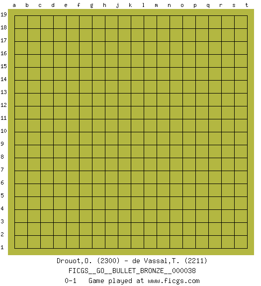 Last move : 0-1 2009 August 15 1:19:40 [Event "FICGS__GO__BULLET_BRONZE__000038"] [Site "FICGS"] [Date "2009.08.14"] [Round "1"] [Black "Drouot,Olivier"] [White "de Vassal,Thibault"] [Result "0-1"] [Rating 1 "2300"] [Rating 2 "2211"] 0-1 This go game has been lost on time (started : 2009.08.14 23:6:56) Here are the names of the openings (joseki) played in the four corners : Player White won this Go (weiqi, baduk) game. Follow this game move after move (download)Extend one hand from the cutting points. (Anonymous) The Internet isn't free. It just has an economy that makes no sense to capitalism. (Brad Shapcott)