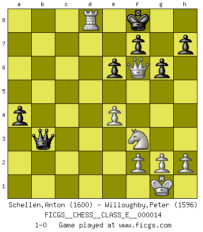 Last move : 1-0 2006 October 2 22:49:0 [Event "FICGS__CHESS__CLASS_E__000014"] [Site "FICGS"] [Date "2006.09.23"] [Round "1"] [White "Schellen,Anton"] [Black "Willoughby,Peter"] [Result "1-0"] [WhiteElo "1600"] [BlackElo "1596"] 1.b4 e6 2.Bb2 Qe7 3.a3 Nf6 4.e3 g6 5.Nf3 Bg7 6.Be2 O-O 7.O-O d5 8.c4 c5 9.d4 cxd4 10.Bxd4 Nc6 11.Bc5 Qe8 12.Bxf8 Qxf8 13.Qb3 Bd7 14.Nbd2 Nd8 15.Rad1 a5 16.b5 b6 17.e4 dxc4 18.Nxc4 Be8 19.Nxb6 Rb8 20.Qc2 Bxb5 21.Bxb5 Rxb6 22.Qc7 Rxb5 23.Rxd8 Ne8 24.Qd7 Qxa3 25.Qxb5 Bf8 26.Rxe8 Kg7 27.Qe5+ Kg8 28.Rd1 a4 29.Qf6 Qb3 30.Rxf8+ Kxf8 31.Rd8+ 1-0 Polish (Sokolsky) opening Kingside Castling by player Black (move 6) Kingside Castling by player White (move 7) Player White won this chess game. Follow this game move after move (download)When the Chess game is over, the Pawn and the King go back to the same box. (Irish saying) Ich bin Weltmeister und muß mit niemandem irgend etwas diskutieren. (Viswanathan Anand) Muchos jugadores de Ajedrez se sorprendían cuando después de la partida, Fischer explicaba con calma: 'Yo ya había analizado esta posibilidad' en una posición en la cual yo creía que no era posible de prever desde la apertura. (Mikhail Tal) Je ne suis pas le dernier à jouer lâchement des coups douteux pendant le zeïtnot de l'adversaire pour l'achever: en effet les coups qui font le plus peur sont ceux que l'on ne comprend pas. Je me fais souvent peur quand je joue. (Un professeur anonyme) Life is painting a picture, not doing a sum. (Oliver Wendell Holmes, Jr.)