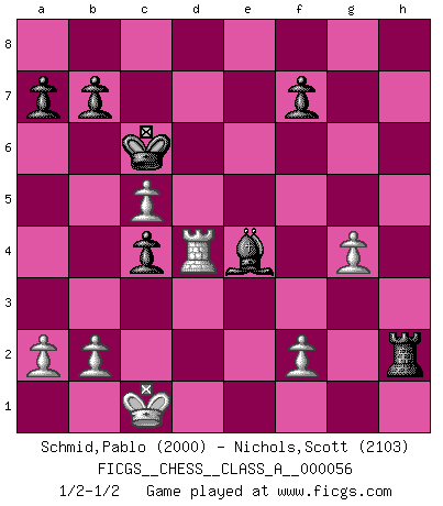 Last move : 1/2-1/2 2009 August 19 7:53:48 [Event "FICGS__CHESS__CLASS_A__000056"] [Site "FICGS"] [Date "2009.08.15"] [Round "1"] [White "Schmid,Pablo"] [Black "Nichols,Scott"] [Result "1/2-1/2"] [WhiteElo "2000"] [BlackElo "2103"] 1.e4 e5 2.Bc4 Nf6 3.d4 exd4 4.Nf3 Bc5 5.e5 d5 6.exf6 dxc4 7.Qe2+ Be6 8.fxg7 Rg8 9.Bg5 Be7 10.Bxe7 Kxe7 11.Qe4 Nc6 12.Qxh7 Kd7 13.Nc3 Qf6 14.O-O-O Rxg7 15.Qe4 Rg4 16.Rxd4+ Qxd4 17.Nxd4 Rxe4 18.Nxe4 Nxd4 19.Rd1 c5 20.c3 Kc6 21.cxd4 Rh8 22.dxc5 Bd5 23.Rd4 Rxh2 24.g4 Bxe4 1/2-1/2 Bishop's Opening : Urusov gambit Queenside Castling by player White (move 14) This chess game ended in a draw. Follow this game move after move (download)There is only one thing Fischer does in Chess without pleasure: to lose ! (Boris Spassky) Fallen sollten polizeilich verboten werden. (Savielly Grigorievitsch Tartakower) Las Aperturas te enseñan aperturas. ¡Los Finales te enseñan Ajedrez!. (Stephan Gerzadowicz) Le thème de l'attaque double intervient d'une manière ou d'une autre dans l'immense majorité des combinaisons. (Youri Averbakh) Sometimes it pays to stay in bed in Monday, rather than spending the rest of the week debugging Monday's code. (Dan Salomon)