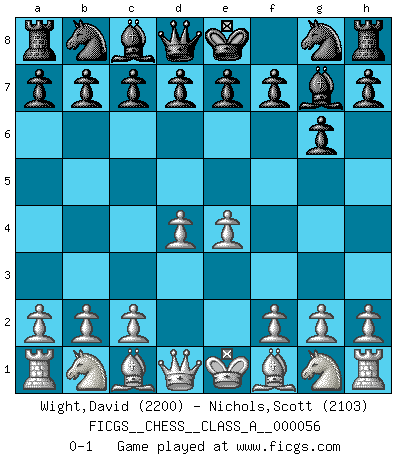 Last move : 0-1 2009 September 24 21:52:36 [Event "FICGS__CHESS__CLASS_A__000056"] [Site "FICGS"] [Date "2009.08.15"] [Round "1"] [White "Wight,David"] [Black "Nichols,Scott"] [Result "0-1"] [WhiteElo "2200"] [BlackElo "2103"] 1.d4 g6 2.e4 Bg7 0-1 This chess game has been lost on time (started : 2009.08.15 15:39:0) Modern defense Player Black won this chess game. Follow this game move after move (download)The boy (then a 12 year old boy named Anatoly Karpov) doesn't have a clue about Chess, and there's no future at all for him in this profession. (Mikhail Botvinnik) Wenn ein Kopf und ein Buch zusammenstoßen und es klingt hohl, ist es denn allemal im Buche? (Georg Christoph Lichtenberg) Al jugar al Ajedrez entonces, podemos aprender: Primero: Previsión... Segundo: Prudencia... Tercero: Cautela... Y al final, aprendemos del Ajedrez el hábito de no ser desanimados por apariencias malas presentes en el estado de nuestros asuntos, el hábito de la esperanza por una oportunidad favorable y la perseveración de los secretos de los recursos. (Benjamin Franklin) On n'a jamais que l'âge auquel on a commence à jouer aux échecs car après on cesse de vieillir. (Capablanca) Internet: Absolute communication, absolute isolation. (Paul Carvel)