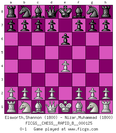 Last move : 0-1 2009 September 22 10:55:9 [Event "FICGS__CHESS__RAPID_B__000125"] [Site "FICGS"] [Date "2009.08.15"] [Round "1"] [White "Elsworth,Shannon"] [Black "Nizar,Muhammad"] [Result "0-1"] [WhiteElo "1800"] [BlackElo "1800"] 1.e4 e6 0-1 This chess game has been lost on time (started : 2009.08.15 17:49:4) French defense Player Black won this chess game. Follow this game move after move (download)Chess is the art which expresses the science of logic. (Mikhail Botvinnik) Im Leben werden Partien nie so unstrittig gewonnen wie im Spiel (Emanuel Lasker) Por esta medida (el intervalo entre Fischer y sus contemporaneos), yo le considero el mas grande campeón mundial. (Garry Kasparov) L'action d'une oeuvre littéraire se déroule sur un champ de bataille. Les masques et les types du drame moderne correspondent aux pièces du jeu d'échecs. L'intrigue correspond aux coups et aux gambits, c'est à dire aux techniques du jeu telles qu'utilisées et interprétées par les joueurs. Les tactiques et les péripéties [mouvements] correspondent aux coups exécutés par l'adversaire. (Viktor Shklovsky) A cynic is a man who knows the price of everything but the value of nothing. (Oscar Wilde)
