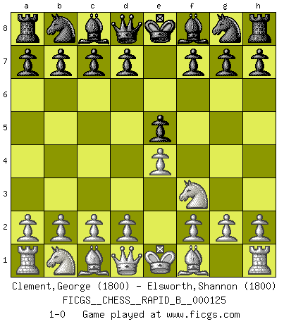 Last move : 1-0 2009 September 16 10:16:19 [Event "FICGS__CHESS__RAPID_B__000125"] [Site "FICGS"] [Date "2009.08.15"] [Round "1"] [White "Clement,George"] [Black "Elsworth,Shannon"] [Result "1-0"] [WhiteElo "1800"] [BlackElo "1800"] 1.e4 e5 2.Nf3 1-0 This chess game has been lost on time (started : 2009.08.15 17:49:4) King's knight Opening Player White won this chess game. Follow this game move after move (download)What would Chess be without silly mistakes ? (Kurt Richter) Die jungen Leute sollen verstehen, dass sie noch etwas von mir lernen können und müssen. (Viktor Kortschnoi) Yo adoro todas la posiciones. Denme una partida posicional difícil, y la jugaré. Pero posiciones totalmente ganadas, no las tolero. (Hein Donner) Le joueur d'Echecs qui veut atteindre le top est obligé de développer son propre credo créatif. Alexeï Stepanovicth Souétine. Il est facile d'écrire des livres ! Ce qui est difficile, c'est de jouer ! (Alexeï Stepanovicth Souétine) Happy endings are just stories that haven't finished yet. (Jane Smith in Mr & Mrs Smith)