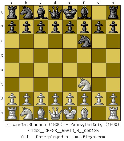 Last move : 0-1 2009 September 25 21:55:4 [Event "FICGS__CHESS__RAPID_B__000125"] [Site "FICGS"] [Date "2009.08.15"] [Round "1"] [White "Elsworth,Shannon"] [Black "Panov,Dmitriy"] [Result "0-1"] [WhiteElo "1800"] [BlackElo "1800"] 1.Nf3 Nf6 0-1 This chess game has been lost on time (started : 2009.08.15 17:49:4) Reti Opening Player Black won this chess game. Follow this game move after move (download)Chess is a fairy tale of 1001 blunders. (Savielly Tartakower) Dein Körper muss in Topform sein. Dein Schach verfällt, wenn dein Körper verfällt. Der Körper kann nicht vom Geist getrennt werden. (Robert James Fischer) Un juego de Ajedrez es un dialogo, una conversación entre un jugador y su oponente. Cada movimiento del oponente puede contener amenazas o tropiezos, pero un jugador no se puede defender de las amenazas o tomar ventaja de los tropiezos si es que no se pregunta a sí mismo: ¿Que es lo que mi oponente va a hacer después de cada movida?. (Bruce A. Moon) Les Echecs mettent en conflit, non pas deux intelligences, mais deux volontés. (Lasker) Treat your password like your toothbrush. Don't let anybody else use it, and get a new one every six months. (Clifford Stoll)