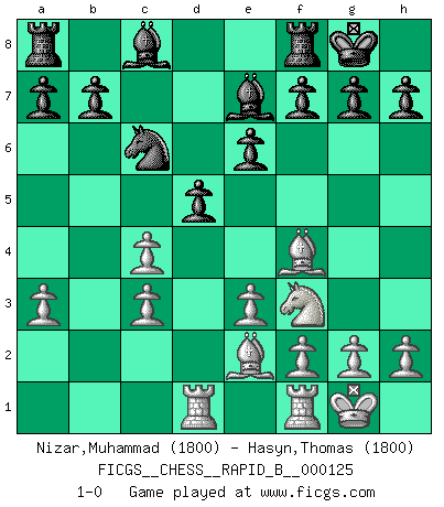Last move : 1-0 2009 October 31 20:3:3 [Event "FICGS__CHESS__RAPID_B__000125"] [Site "FICGS"] [Date "2009.08.15"] [Round "1"] [White "Nizar,Muhammad"] [Black "Hasyn,Thomas"] [Result "1-0"] [WhiteElo "1800"] [BlackElo "1800"] 1.d4 Nf6 2.c4 e6 3.Nf3 d5 4.Nc3 Be7 5.Bf4 O-O 6.e3 c5 7.dxc5 Bxc5 8.Qc2 Nc6 9.a3 Qa5 10.Rd1 Be7 11.Be2 Ne4 12.O-O Nxc3 13.Qxc3 Qxc3 14.bxc3 1-0 This chess game has been lost on time (started : 2009.08.15 17:49:4) Queen's pawn game Kingside Castling by player Black (move 5) Kingside Castling by player White (move 12) Player White won this chess game. Follow this game move after move (download)Don't even mention losing to me. I can't stand to think of it. (Bobby Fischer) Rauchen ist dem Schachspieler bei seiner Arbeit, also im Wettkampf, untersagt. (Viktor Kortschnoi) Fischer es el jugador mas fuerte del mundo. De hecho, el jugador mas fuerte que jamas haya existido. (Larry Evans) Seul un grand joueur sait à quel point il joue faiblement. (Xavier Tartacover) If you don't practice you don't deserve to win. (Andre Agassi)
