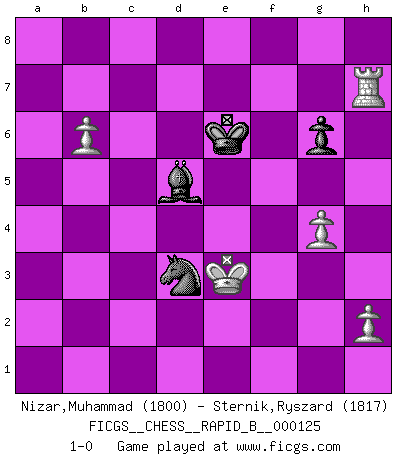 Last move : 1-0 2009 December 2 12:4:23 [Event "FICGS__CHESS__RAPID_B__000125"] [Site "FICGS"] [Date "2009.08.15"] [Round "1"] [White "Nizar,Muhammad"] [Black "Sternik,Ryszard"] [Result "1-0"] [WhiteElo "1800"] [BlackElo "1817"] 1.d4 Nf6 2.c4 c5 3.d5 g6 4.Nc3 d6 5.e4 Bg7 6.Be2 O-O 7.Nf3 e6 8.Bf4 exd5 9.cxd5 a6 10.a4 Nh5 11.Be3 f5 12.exf5 Bxf5 13.Nd2 Nf6 14.O-O a5 15.Nc4 Na6 16.Bf4 Ne8 17.Qd2 Nb4 18.Rac1 Qf6 19.Be3 Ra6 20.Rfe1 Qf7 21.f3 Bd7 22.Bf1 Bf6 23.Bf2 Kg7 24.b3 Bxc3 25.Qxc3+ Kg8 26.Qd2 Qf6 27.Be3 Qf7 28.Bxc5 dxc5 29.Ne5 Qg7 30.Bxa6 Nxa6 31.Qxa5 Bf5 32.Qb6 Rf6 33.Qd8 Rf8 34.g4 Nec7 35.Qg5 Bc8 36.d6 Ne6 37.Qe7 Qxe7 38.dxe7 Re8 39.Nc4 Kf7 40.Nd6+ Kxe7 41.Nxe8 Kxe8 42.b4 b6 43.a5 Nxb4 44.axb6 Kd7 45.Rxe6 Kxe6 46.Rxc5 Bb7 47.Rc7 Bxf3 48.Kf2 Bd5 49.Rxh7 Nd3+ 50.Ke3 1-0 Benoni defense Kingside Castling by player Black (move 6) Kingside Castling by player White (move 14) 10 pieces endgame at move 47 : White KRPPP , Black KBNPP WHITE : King + 1 Rook 3 Pawns BLACK : King + 1 Bishop 1 Knight 2 Pawns 9 pieces endgame at move 49 : White KRPPP , Black KBNP WHITE : King + 1 Rook 3 Pawns BLACK : King + 1 Bishop 1 Knight 1 Pawn Player White won this chess game. Follow this game move after move (download)At this time Fischer is simply a level above all the best Chessplayers in the world. (John Jacobs) Jeder Schachmeister war einmal ein Anfänger. (Irving Chernev) La señal de un Gran Maestro es su habilidad de ganar una partida rápidamente y sin dolor. (Irving Chernev) L'ordinateur a tué l'originalité. Il n'y a plus guère d'aventures sur l'échiquier. (Jacob Murray) Strategy without tactics is the slowest route to victory. Tactics without strategy is the noise before defeat. (Sun Tzu)