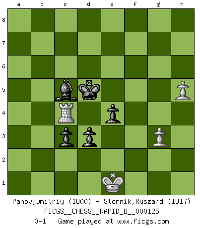 Last move : 0-1 2009 October 11 21:54:44 [Event "FICGS__CHESS__RAPID_B__000125"] [Site "FICGS"] [Date "2009.08.15"] [Round "1"] [White "Panov,Dmitriy"] [Black "Sternik,Ryszard"] [Result "0-1"] [WhiteElo "1800"] [BlackElo "1817"] 1.e4 e6 2.d4 d5 3.e5 c5 4.c3 Nc6 5.Nf3 Bd7 6.a3 Qb6 7.b4 cxd4 8.cxd4 Rc8 9.Be3 Nh6 10.Bxh6 gxh6 11.Be2 Bg7 12.O-O a6 13.Qd3 f6 14.exf6 Bxf6 15.Rd1 Nxd4 16.Nxd4 Ba4 17.Bh5+ Kd7 18.Re1 Qxd4 19.Qxd4 Bxd4 20.Ra2 Kd6 21.Bg4 Rce8 22.Nd2 e5 23.Nf1 Bb3 24.Rae2 Bc4 25.Rc2 Rhf8 26.h3 Bd3 27.Ra2 Rf6 28.Ne3 Ref8 29.Nd1 e4 30.Rd2 b6 31.g3 a5 32.Kg2 b5 33.h4 a4 34.Rh1 Bb6 35.Re1 Kc7 36.Ne3 Kc6 37.Rc1+ Bc4 38.Bd1 Kb7 39.Bg4 Rxf2+ 40.Rxf2 Bxe3 41.Rxf8 Bxc1 42.Rf7+ Kc6 43.Rxh7 Kd6 44.Kf2 Ke5 45.Be2 Bxa3 46.Rxh6 Bxb4 47.Bxc4 bxc4 48.h5 Bc5+ 49.Ke1 d4 50.Ra6 c3 51.Rxa4 d3 52.Rc4 Kd5 0-1 French : Advance, Euwe variation Kingside Castling by player White (move 12) 10 pieces endgame at move 47 : White KRPP , Black KBPPPP WHITE : King + 1 Rook 2 Pawns BLACK : King + 1 Bishop 4 Pawns 9 pieces endgame at move 51 : White KRPP , Black KBPPP WHITE : King + 1 Rook 2 Pawns BLACK : King + 1 Bishop 3 Pawns Player Black won this chess game. Follow this game move after move (download)Winning isn't everything... but losing is nothing. (Mednis) Ich könnte leicht behaupten: Ja,ja, Leonid Breschnew wollte nicht, daß ich Weltmeister werde. In der Tat war die Sache komplizierter. (Viktor Kortschnoi) Diferente gente reacciona diferentemente en aceptar la derrota. (Bobby Fischer) Si le désir cupide (et stupide) de gagner est une inépuisable source de souffrance, une combinaison brillante sur l'échiquier est une découverte : le coquelicot qui s'épanouit lorsque apparaît la Voie Lactée. (Arrabal) Always be a first-rate version of yourself, instead of a second-rate version of somebody else. (Judy Garland)