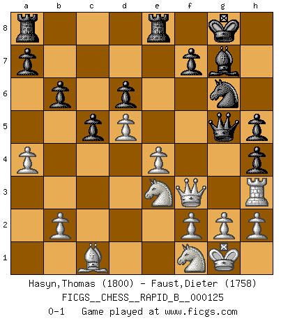 Last move : 0-1 2009 October 25 7:28:51 [Event "FICGS__CHESS__RAPID_B__000125"] [Site "FICGS"] [Date "2009.08.15"] [Round "1"] [White "Hasyn,Thomas"] [Black "Faust,Dieter"] [Result "0-1"] [WhiteElo "1800"] [BlackElo "1758"] 1.d4 Nf6 2.c4 c5 3.d5 e6 4.Nf3 exd5 5.cxd5 d6 6.e4 g6 7.Nc3 Bg7 8.Be2 O-O 9.O-O Re8 10.Nd2 Nbd7 11.a4 Ne5 12.Qc2 Nh5 13.Bxh5 gxh5 14.Nd1 b6 15.Ra3 Ba6 16.Rh3 h4 17.Ne3 Bd3 18.Qd1 Bxf1 19.Ndxf1 Ng6 20.Qg4 h5 21.Qf3 Qg5 0-1 This chess game has been lost on time (started : 2009.08.15 17:49:4) Benoni defense Kingside Castling by player Black (move 8) Kingside Castling by player White (move 9) Player Black won this chess game. Follow this game move after move (download)Later, I began to succeed in decisive games. Perhaps because I realized a very simple truth: not only was I worried, but also my opponent. (Mikhail Tal) Ich suche im Schach immer etwas Eigenes. Riskantes Spiel im Stile schachlicher Musketiere ist nicht meine Sache, auch wenn es vielen Freunden scharfer Wendungen gefällt. (Anatoly Karpov) Si yo gano un torneo, yo lo gano por mí mismo. Yo hago las jugadas. Nadie me ayuda. (Bobby Fischer) La victoire dans une partie d'Echecs appartient la plupart du temps à celui qui voit un peu plus loin que l'adversaire. (Lasker) Luck is when opportunity knocks and you answer. (Anonymous)