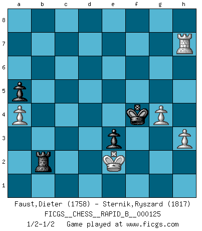 Last move : 1/2-1/2 2009 October 17 15:26:7 [Event "FICGS__CHESS__RAPID_B__000125"] [Site "FICGS"] [Date "2009.08.15"] [Round "1"] [White "Faust,Dieter"] [Black "Sternik,Ryszard"] [Result "1/2-1/2"] [WhiteElo "1758"] [BlackElo "1817"] 1.d4 Nf6 2.c4 e6 3.Nc3 b6 4.e4 Bb7 5.f3 d5 6.cxd5 exd5 7.e5 Nfd7 8.f4 c5 9.Nf3 Nc6 10.Bb5 Nxd4 11.Nxd4 cxd4 12.Ne2 d3 13.Qxd3 a6 14.Bxd7+ Qxd7 15.O-O Bc5+ 16.Be3 O-O 17.Nd4 a5 18.Rf3 Ba6 19.Qd1 f6 20.e6 Qd6 21.Nf5 Qxe6 22.Bxc5 bxc5 23.Qxd5 Qxd5 24.Ne7+ Kf7 25.Nxd5 Rad8 26.Nc7 Bb7 27.Rb3 Be4 28.Re1 f5 29.Rb6 Rd2 30.Ne6 Re8 31.Ng5+ Kg8 32.Nxe4 Rxe4 33.Rxe4 fxe4 34.Kf1 c4 35.h3 e3 36.g4 Kf7 37.a4 Ke7 38.f5 Rf2+ 39.Ke1 Kd7 40.Kd1 g6 41.f6 g5 42.Rb5 Ke6 43.Rxg5 Rd2+ 44.Ke1 Rxb2 45.Rc5 Kxf6 46.Rxc4 Ke5 47.Rc7 Kf4 48.Rxh7 Rb1+ 49.Ke2 Rb2+ 1/2-1/2 Queen's pawn game Kingside Castling by player White (move 15) Kingside Castling by player Black (move 16) 10 pieces endgame at move 46 : White KRPPP , Black KRPPP WHITE : King + 1 Rook 3 Pawns BLACK : King + 1 Rook 3 Pawns 9 pieces endgame at move 48 : White KRPPP , Black KRPP WHITE : King + 1 Rook 3 Pawns BLACK : King + 1 Rook 2 Pawns This chess game ended in a draw. Follow this game move after move (download)What is the difference between chess and football? Everybody understands football, but nobody plays it. Everybody plays chess, but nobody understands it. Everything is relative. (Vladimir Kramnik) Ohne ihre Erfolge schmälern zu wollen würde ich sagen Petrosian, Spassky und Karpov verdanken ihre Siege ihren Trainern - Boleslavsky, Bondarevsky und Furman. (Mikhail Moiseyevich Botvinik) Peones: ellos son el alma de esta partida, solos forman el ataque y la defensa. (Philidor) L'action d'une oeuvre littéraire se déroule sur un champ de bataille. Les masques et les types du drame moderne correspondent aux pièces du jeu d'échecs. L'intrigue correspond aux coups et aux gambits, c'est à dire aux techniques du jeu telles qu'utilisées et interprétées par les joueurs. Les tactiques et les péripéties [mouvements] correspondent aux coups exécutés par l'adversaire. (Viktor Shklovsky) Quotation,n.: The act of repeating erroneously the words of another. The words erroneously repeated. (Ambrose Bierce, The Devil's Dictionary)